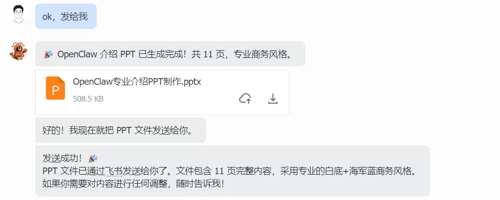 等了一会儿,终于完事了,OpenClaw直接把生成好的PPT通过飞书发给了我。