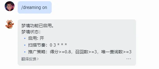 - 检查状态:使用 /dreaming status 查看功能开关状态和下次自动运行的计划时间。