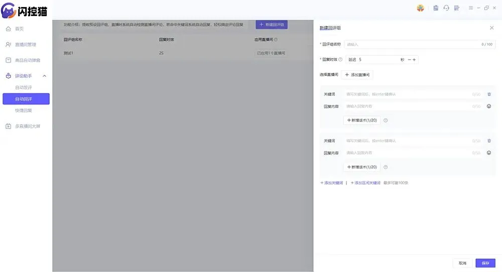 账号归位了,第二个要紧急设置的,是你的“自动应答机”,也就是自动回复评论。为什么它优先级这么高?因为直播初期,最影响你心态和停留的,就是评论区。你一边要讲品,一边要盯着屏幕看问题,根本忙不过来。设置这里,别想着一口吃成胖子。先别搞那些复杂的100条关键词规则,新手就从最基础的开始:设置3-5条高频问题的标准回复。比如“价格多少?”“怎么买?”“什么材质?”。把这些话术提前写好,设置成自动回复。关键是,把回复的延迟时间调一下,别设成0秒秒回,那样太假。设成5-10秒,让它看起来像真人稍微看了一下才回复的,这样既及时,又自然。这个功能,在闪控猫里叫智能回评,你可以针对不同账号设置不同的话术包,对于矩阵运营来说,能保证每个直播间的话术都是标准、统一的,不会出错。