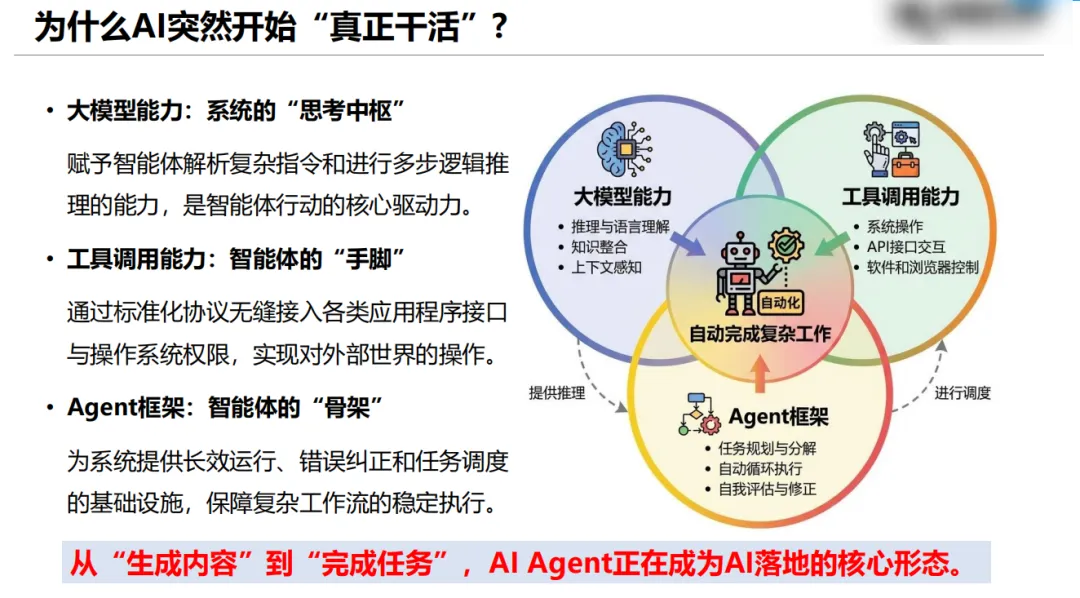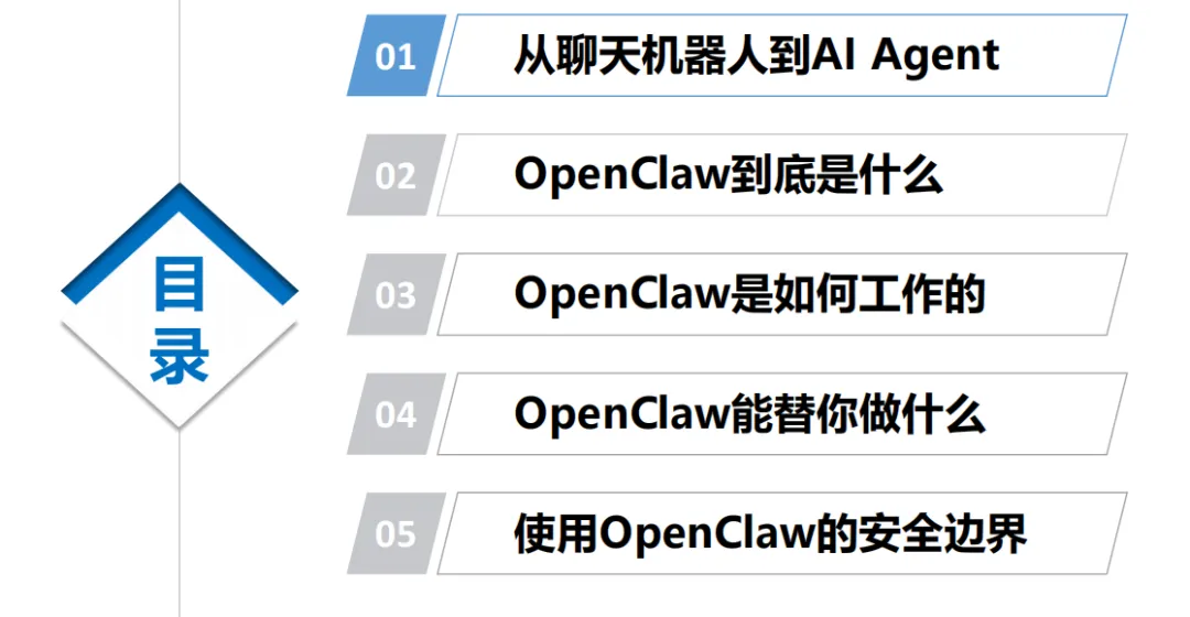 OpenClaw 的出现,标志着 AI 从工具走向智能体。过去我们用的聊天机器人只能回答问题、生成文案,属于被动响应的 “AI 顾问”;而以 OpenClaw 为代表的 AI Agent,是能听懂目标、拆解任务、调用工具、自动执行的 “AI 助手”。它就像给电脑装上了大脑和手脚,你只需要说一句话,它就能帮你完成一整套流程。