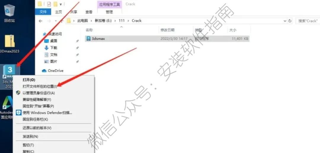 9、回到文件夹打开“Crack”文件夹选中“3dsmax.exe”,复制,选中桌面的3dmax2023,右键,选中“打开文件所在位置”,然后粘贴,选择“替换目标中的文件”!