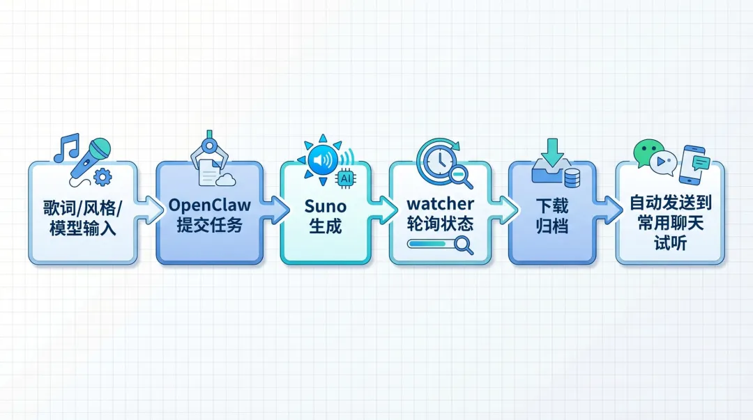 我现在做 AI 音乐,已经不是手动去网页点生成了,而是把 OpenClaw 当成一个音乐工作流中枢:我负责写歌词和定风格,它负责提交任务、等待结果、下载归档,再把成品自动发到团队聊天里试听。