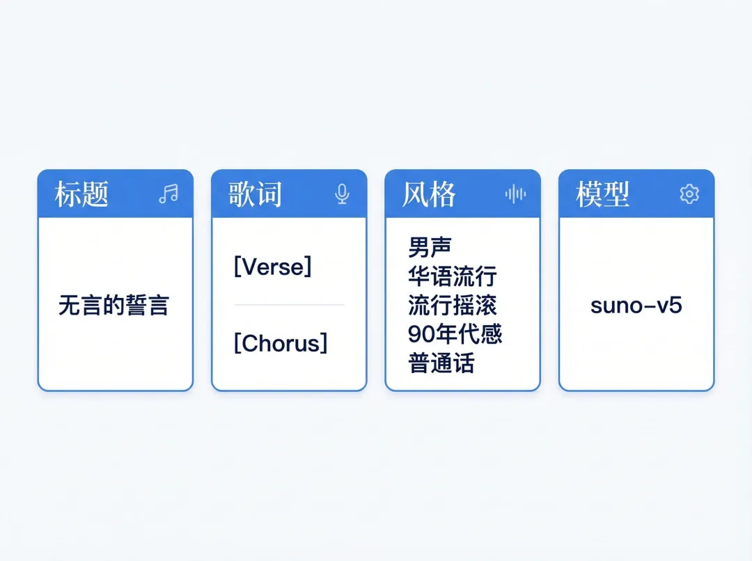 title:无言的誓言model:suno-v5style:男声,华语流行,流行摇滚,90年代感,普通话lyrics:| [Verse 1] 夜色落在窗边 像没说完的话 [Chorus]我把沉默唱成海把告别藏进人海这里面最容易被低估的,通常是歌词结构和风格描述。