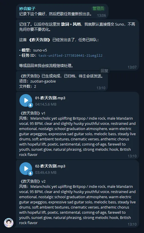 现在我的做法是,音乐一生成完,系统就把成品直接发到指定聊天里。