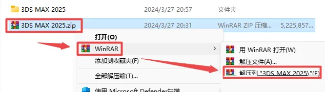 1.选中下载的压缩包,然后鼠标右键选择解压到“3ds Max 2025温馨提示:win11系统需先点击“显示更多选项”