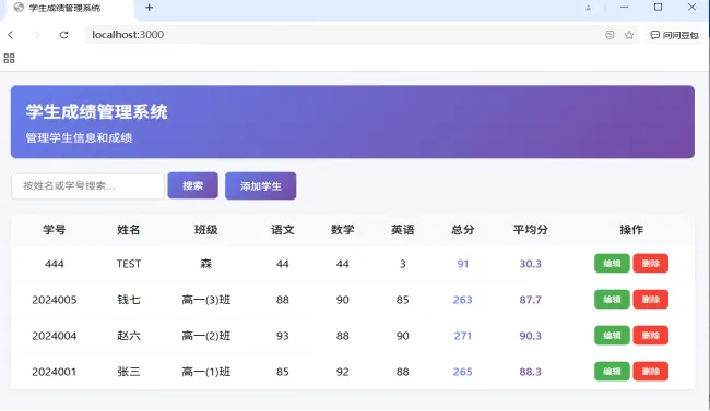 3. 页面要美观简洁,使用中文界面,有表格展示所有学生成绩