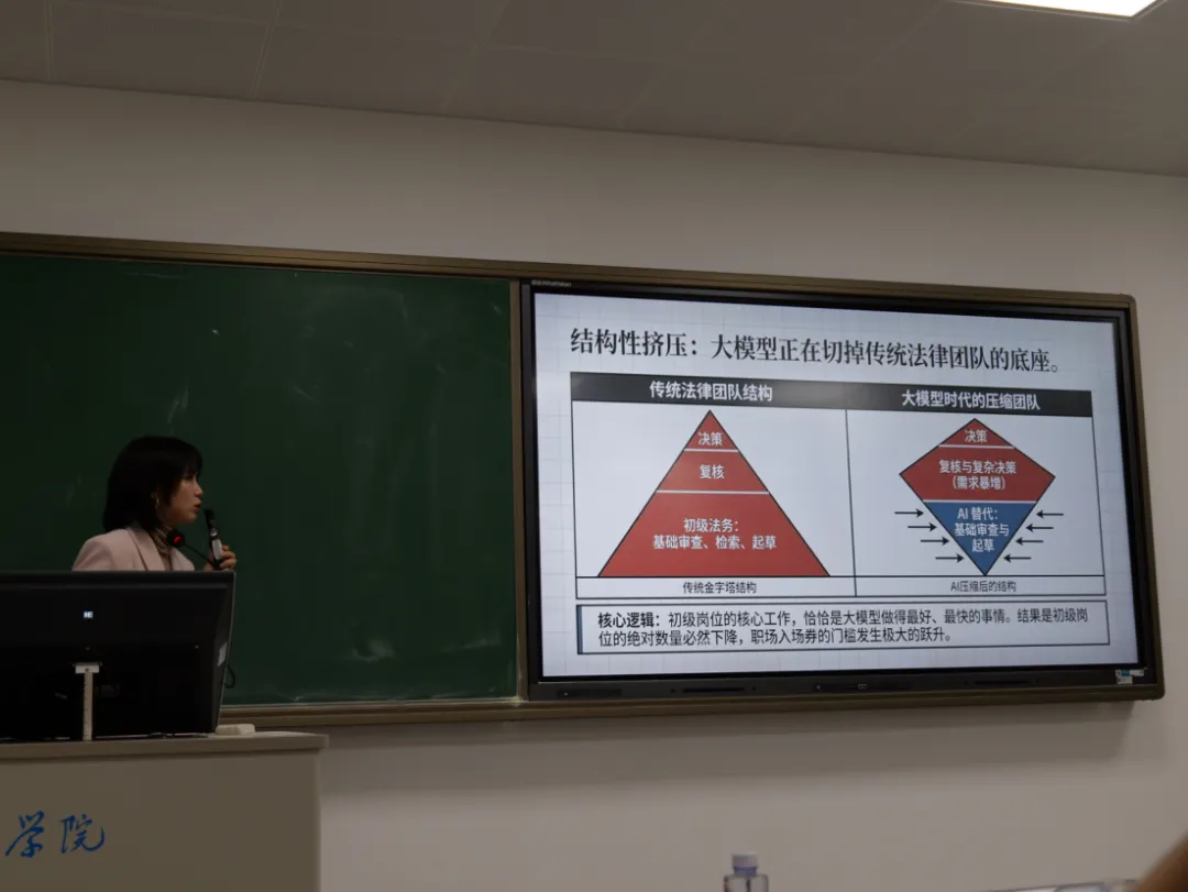 也正因此,杨老师提醒同学们,未来法律职业的发展逻辑很可能与以往完全不同。过去的职业成长往往是阶梯式的:先做基础工作,再在反复训练中逐渐积累经验,最后进入更复杂的业务场景;而现在,这一套路径正在被重写。许多单位不再愿意花长时间去培养只能做初级工作的新人,而是默认新入职者从一开始就要能够站在AI给出的结果之上继续发现问题、判断风险、提出修改意见。原本属于“一年级”“二年级”的训练环节被压缩甚至跳过,法律新人进入组织后,往往就会被要求按照更高标准去完成工作。这种变化并不意味着成长机会彻底消失,而是意味着未来法律人的成长将更依赖于判断能力、复核能力和综合处理能力,而不是单纯依赖大量重复劳动带来的熟练度。