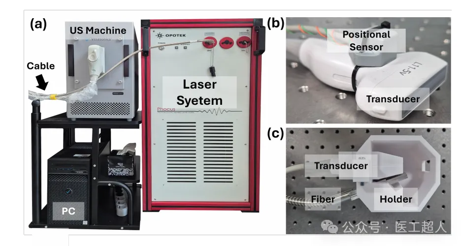 PAUS数据采集的实验设置和可视化结果。(a) 超声机与激光系统连接。(b) 和 (c) 传感器设置。
