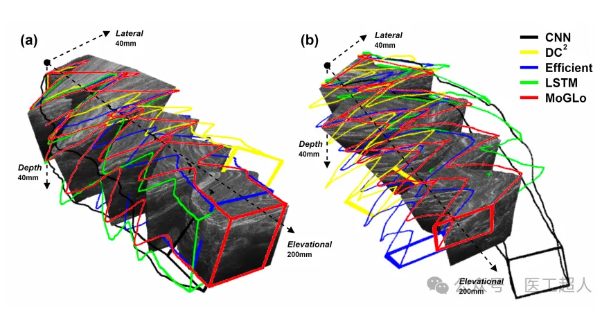 使用公开开放数据集的两个3D重建案例。3D真实图像通过使用真实位置堆叠2D B模式图像构建。不同颜色的轮廓3D图形(没有填充)是使用来自各种深度学习模型的估计位置构建的,用于将它们的轨迹与真实数据进行比较。