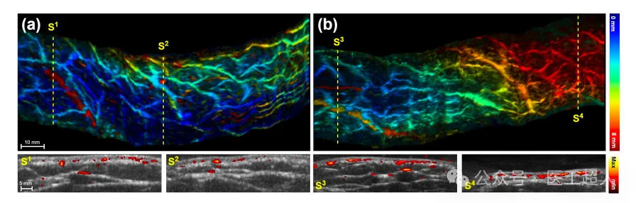 使用PAUS采集的两个3D血管重建案例。每个案例都通过最大振幅投影(mAP)根据深度进行可视化,并展示相应的B模式横截面图像。