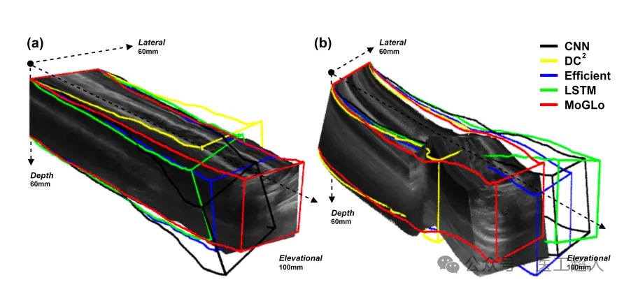 使用超声B模式采集的两个3D重建案例。每个案例从两个不同的方向视角展示。3D真实图像通过使用真实位置堆叠2D B模式图像构建。不同颜色的轮廓3D图形(没有填充)是使用来自各种深度学习模型的估计位置构建的,用于将它们的轨迹与真实数据进行比较。