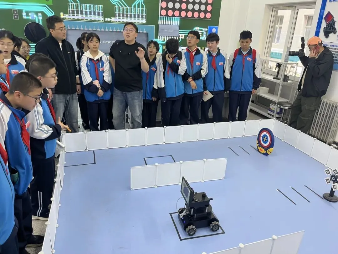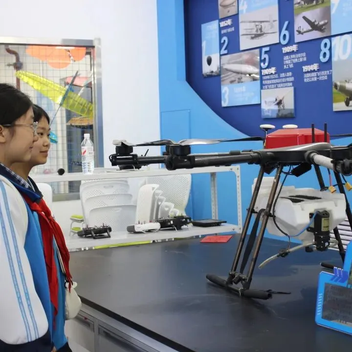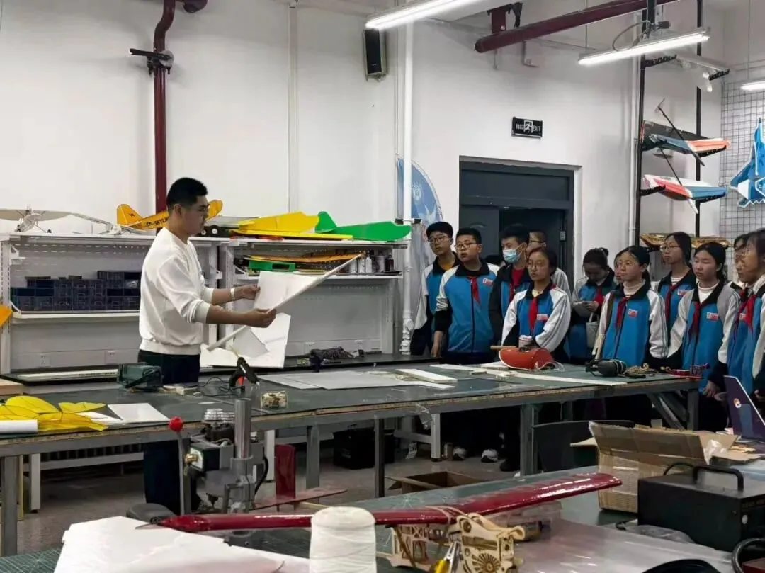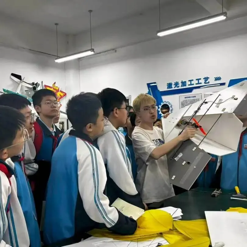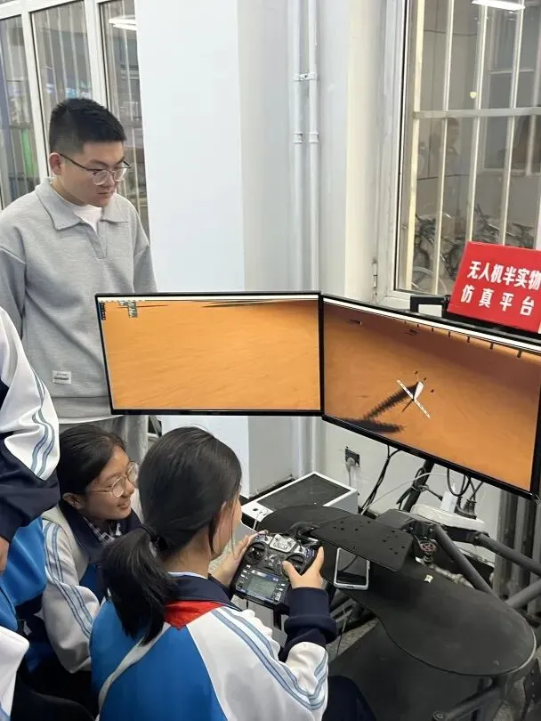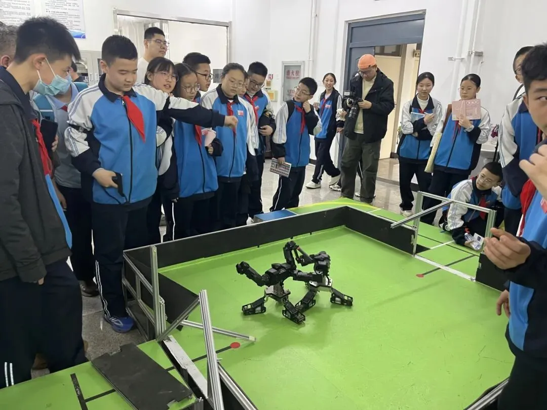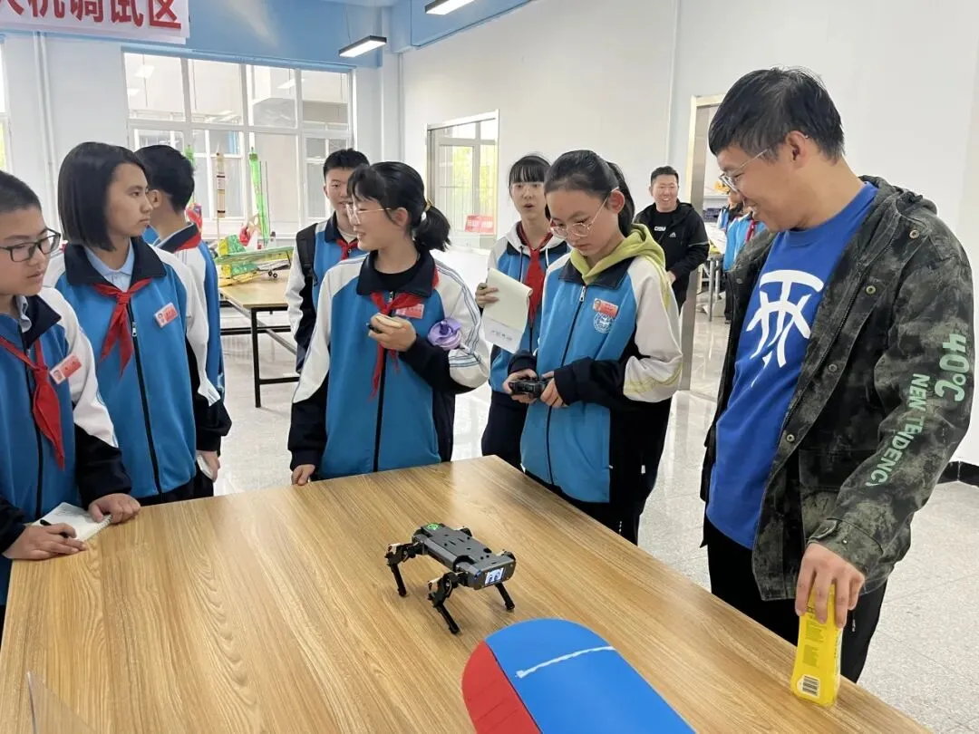 在专业讲解员的引导下,师生们依次参观了模拟飞行器训练区、航空发展史展厅和飞行器结构原理展示区,系统了解了航空科技的发展历程、技术演进与核心原理。现场还设有多个互动体验区域,学生们可以在无人机半实物仿真平台上,通过操控体验精准飞行与智能避障;也可以操作机器狗,感受其灵活的步态和敏捷的指令响应;此外,大家还能近距离观察无人机的组装与调试过程,学习飞行控制及机械结构的基础知识。