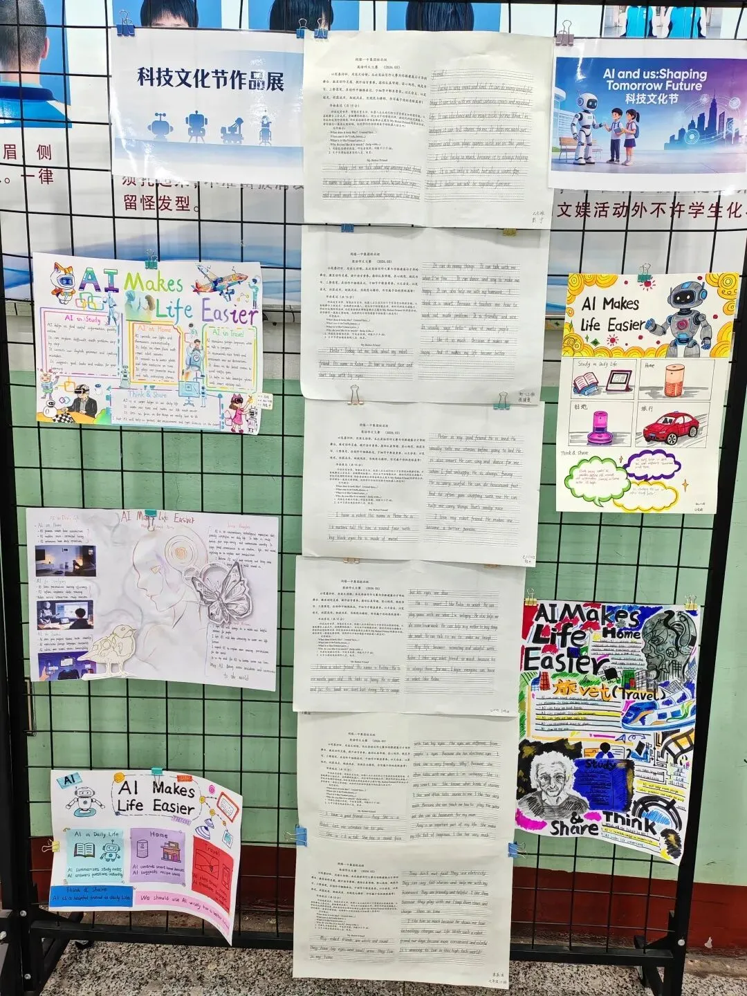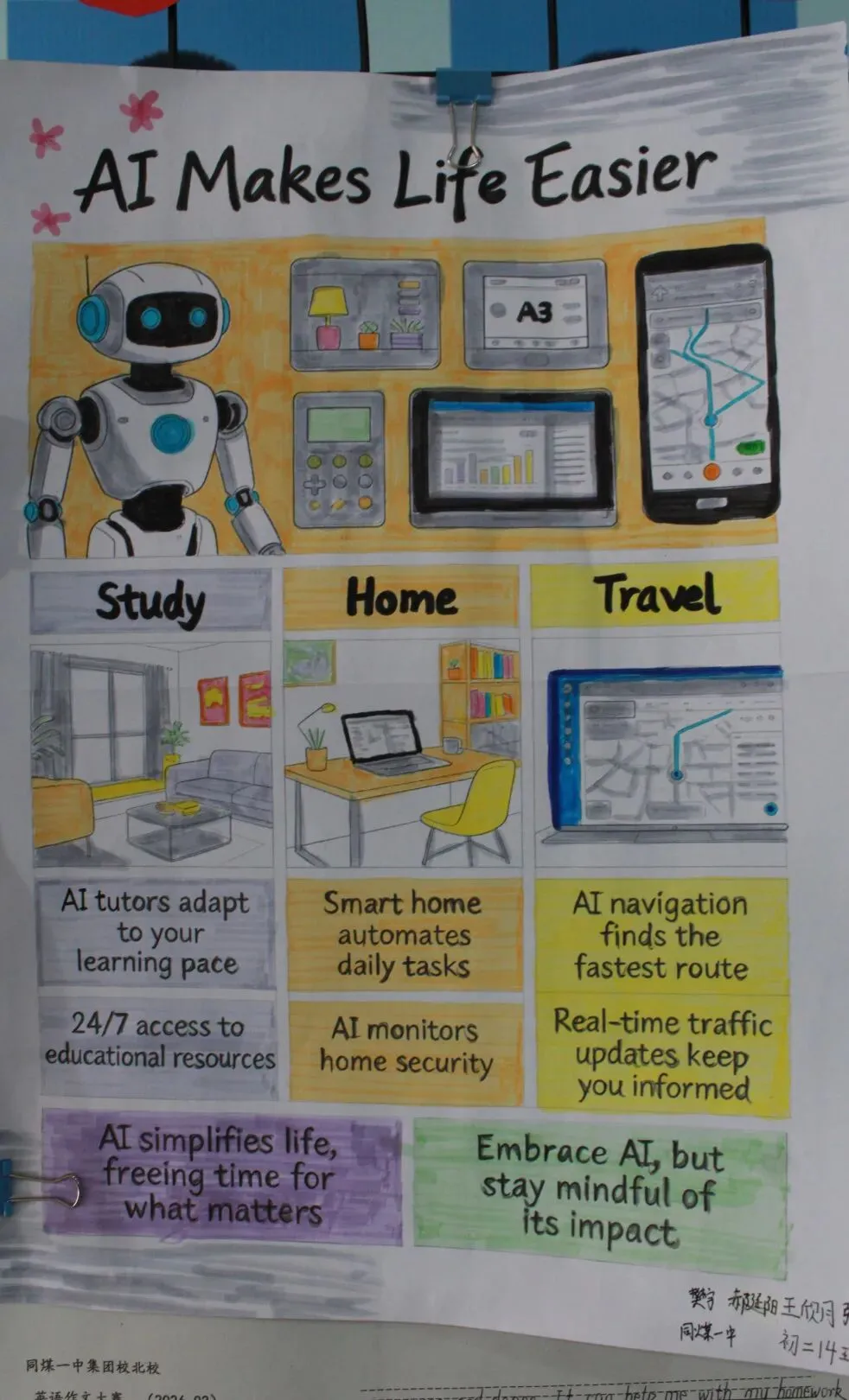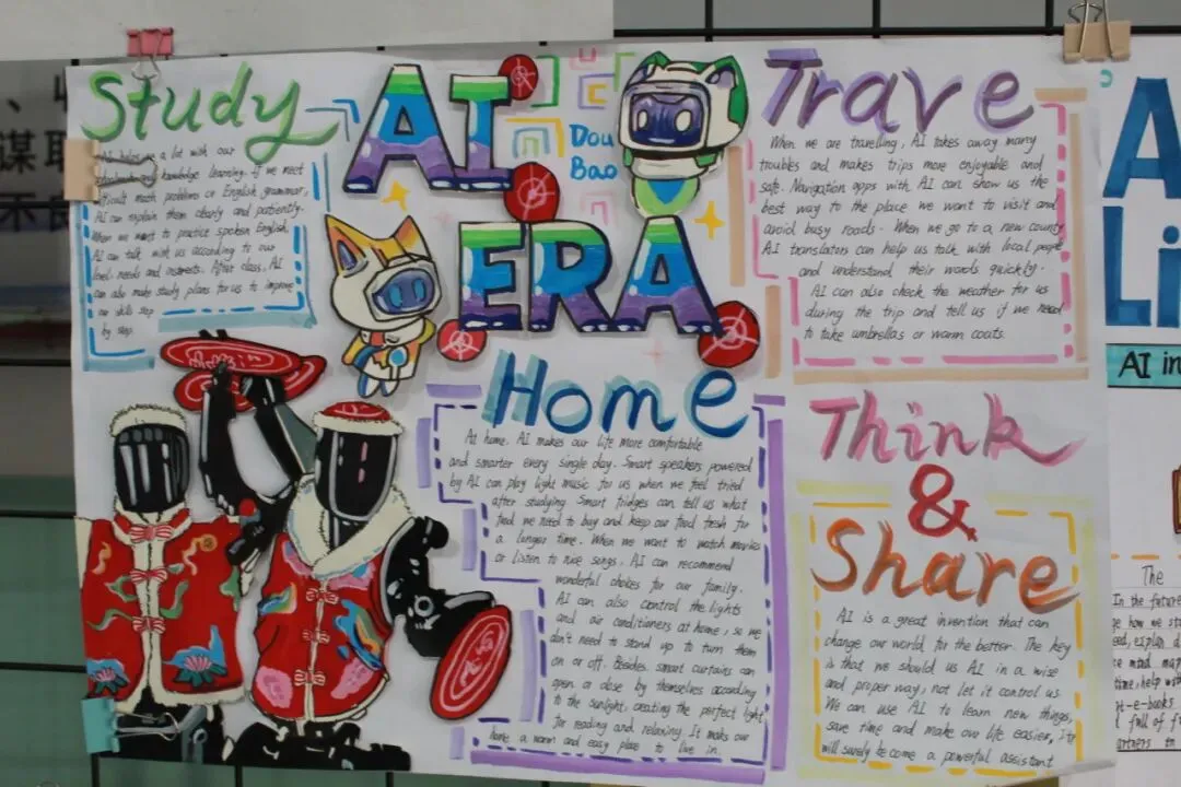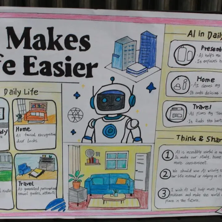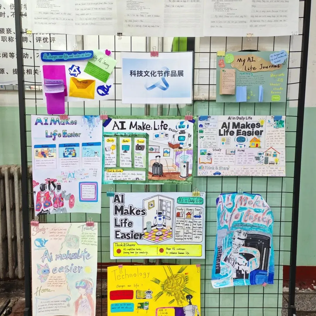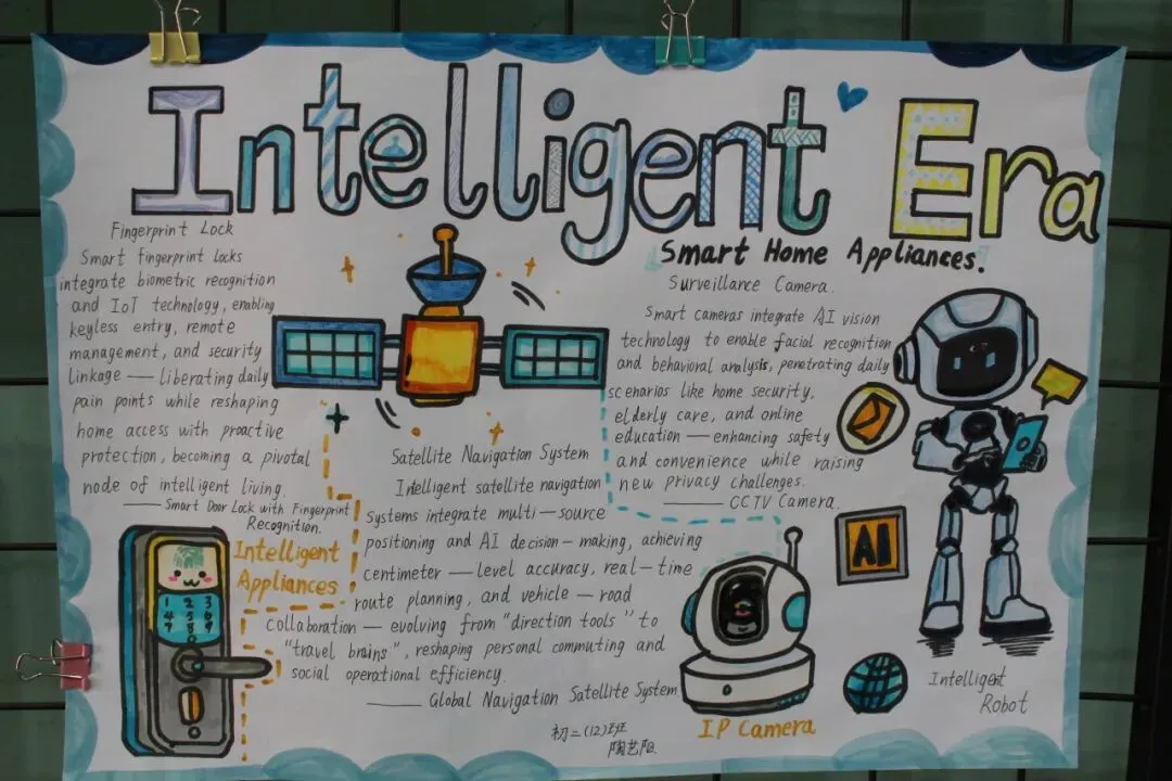 初一开展《My Robot Friend》英文演讲稿写作比赛,初二自主创作AI主题英文立体手账或科普海报。活动夯实了学生英语基础,提升了其创意表达与跨学科应用能力,也让学生切实感受到了英语与科技融合的独特魅力。