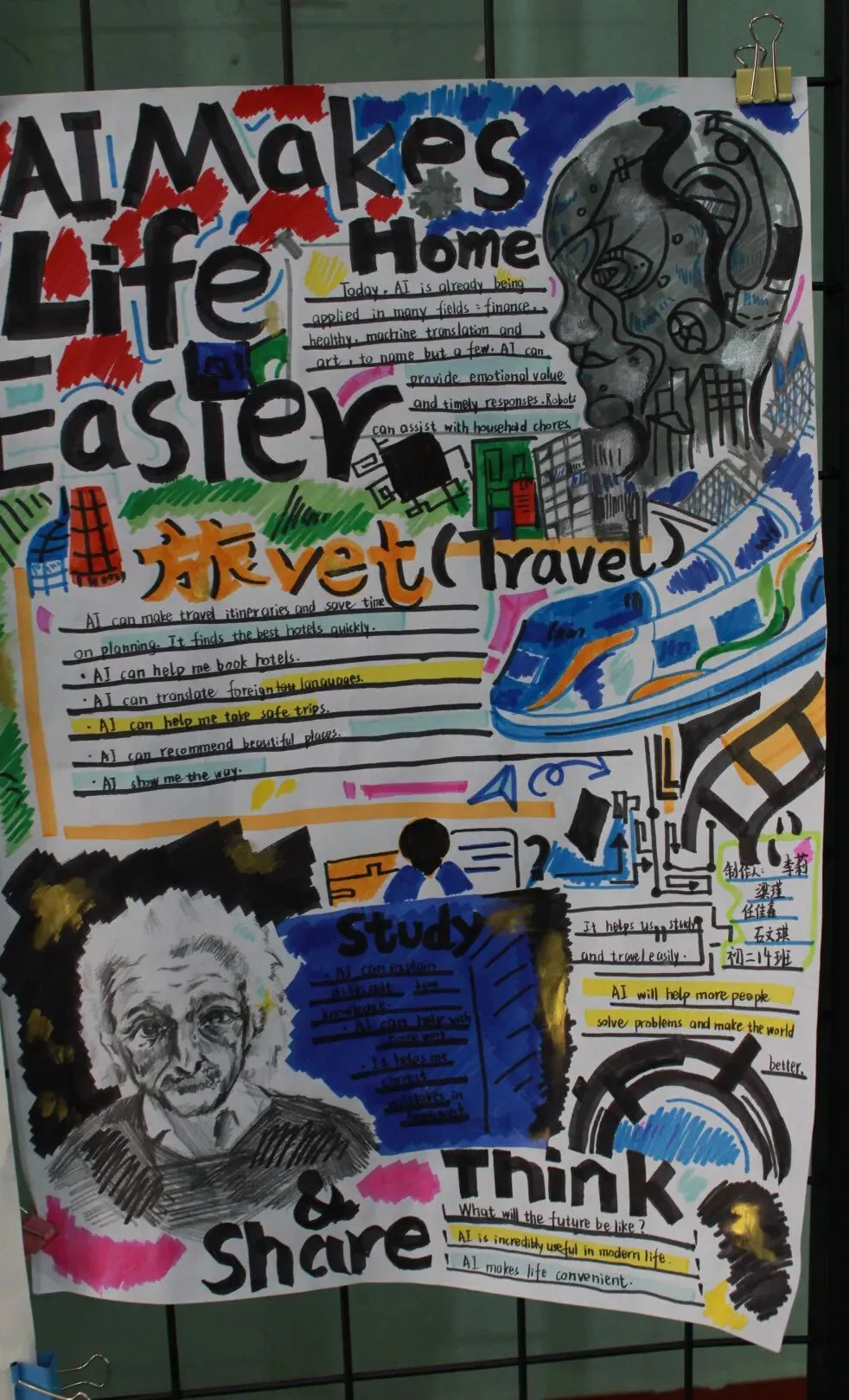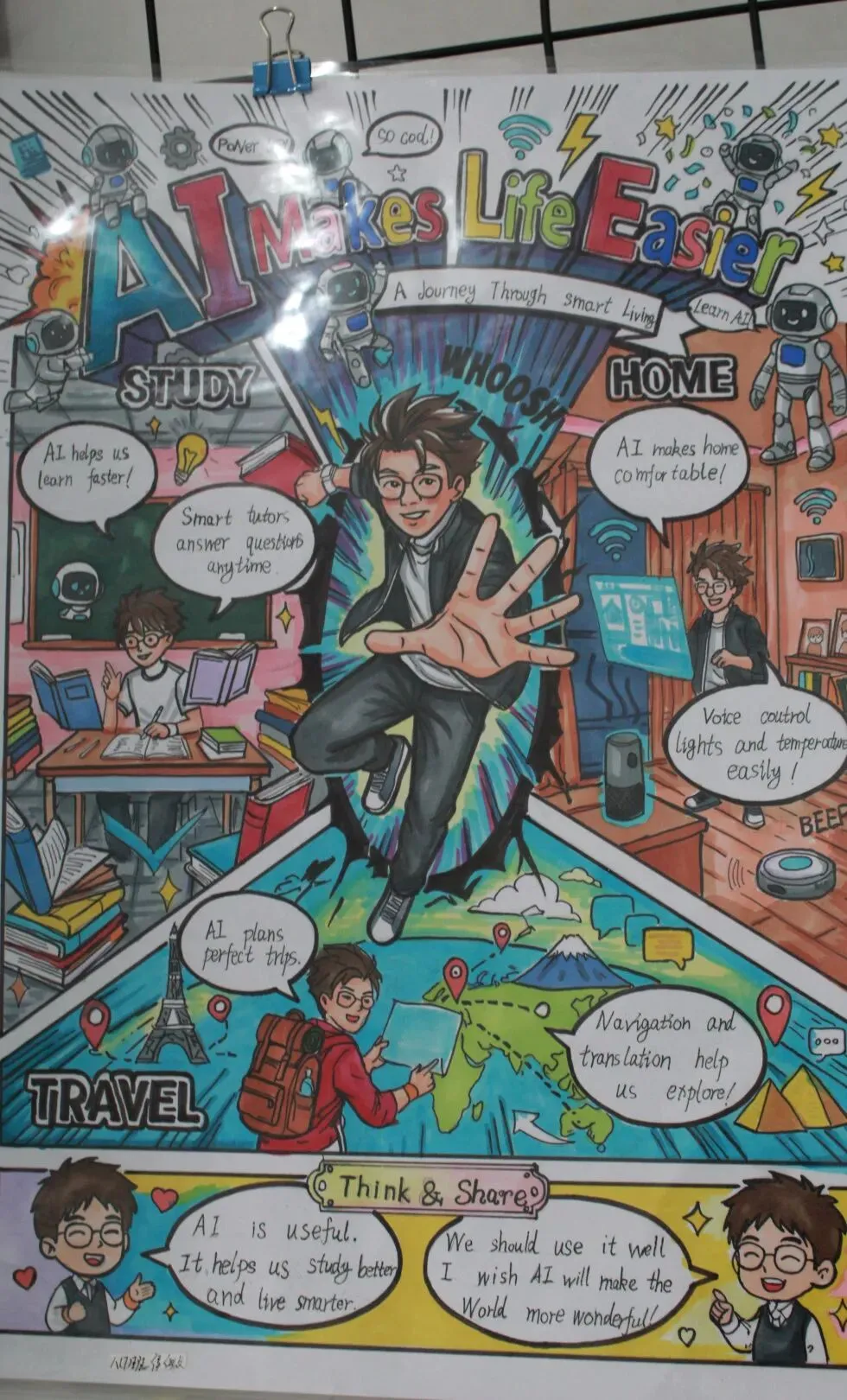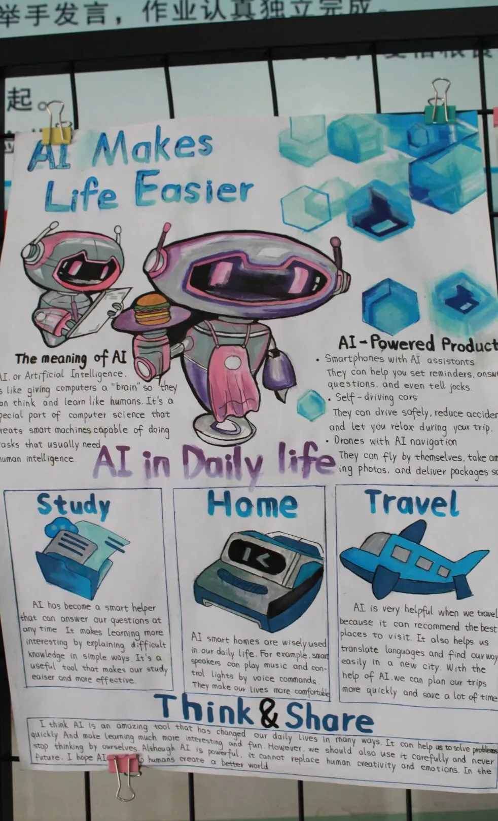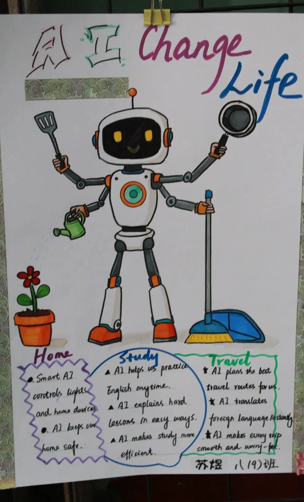 初一开展《My Robot Friend》英文演讲稿写作比赛,初二自主创作AI主题英文立体手账或科普海报。活动夯实了学生英语基础,提升了其创意表达与跨学科应用能力,也让学生切实感受到了英语与科技融合的独特魅力。