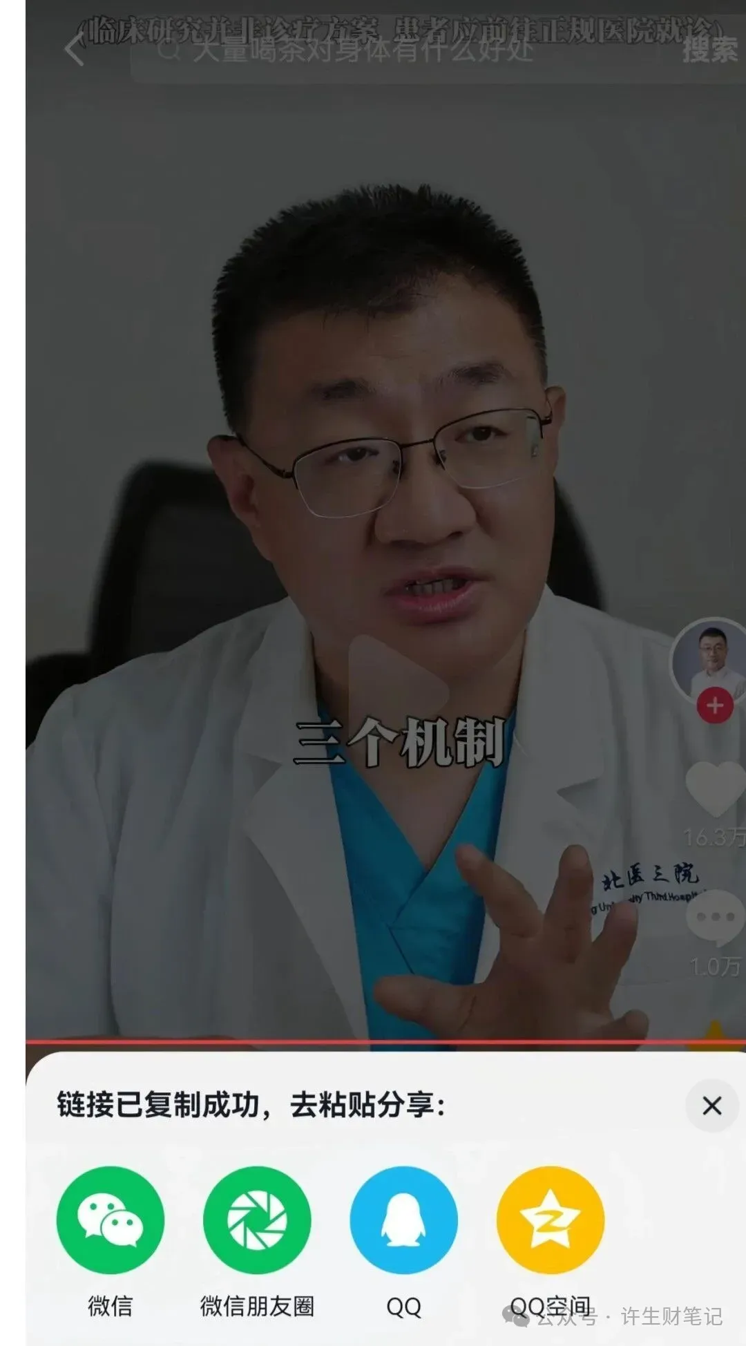 1. 首先在抖音视频中,搜索“喝茶的好处”,选择浏览量大的视频,如下16.3万的高点赞视频。