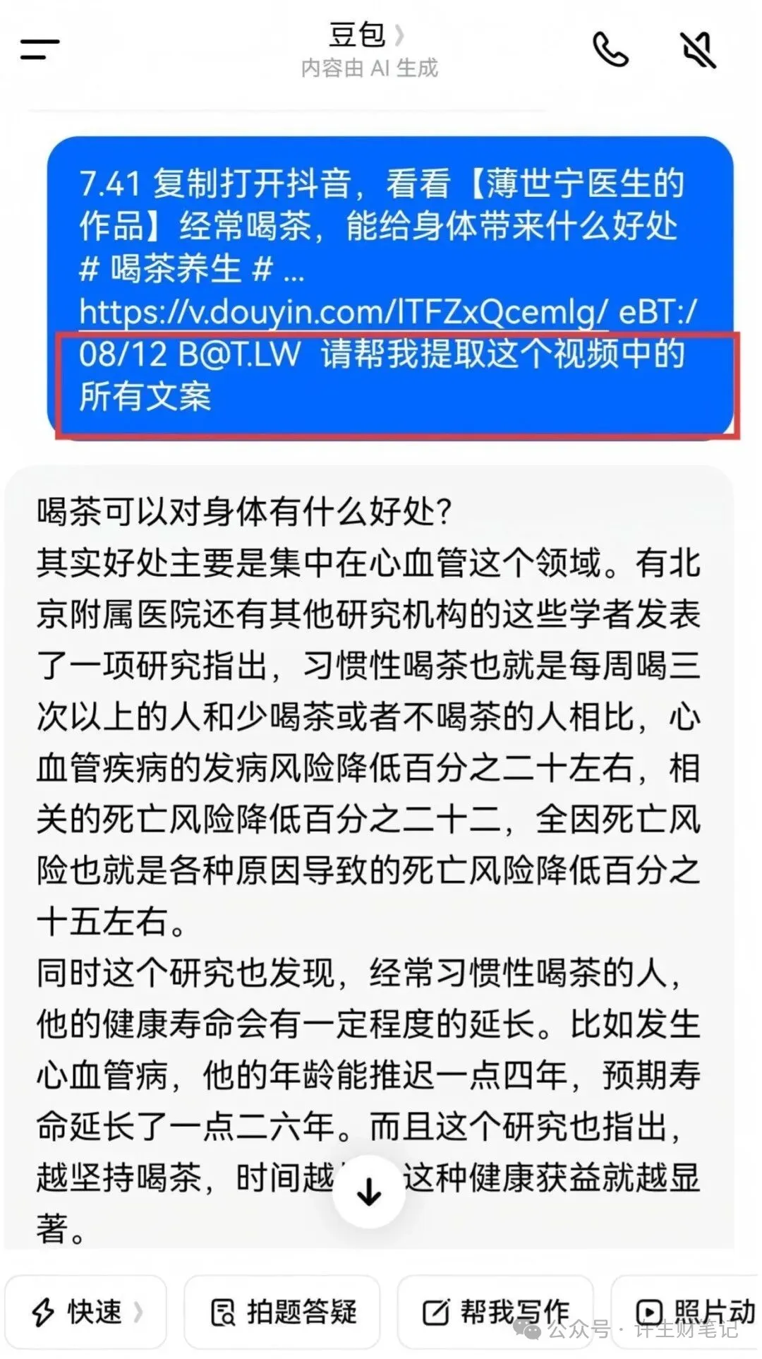 3. 打开豆包 ,粘贴刚才的复制链接,并写上“请帮我提取这个视频中的所有文案”