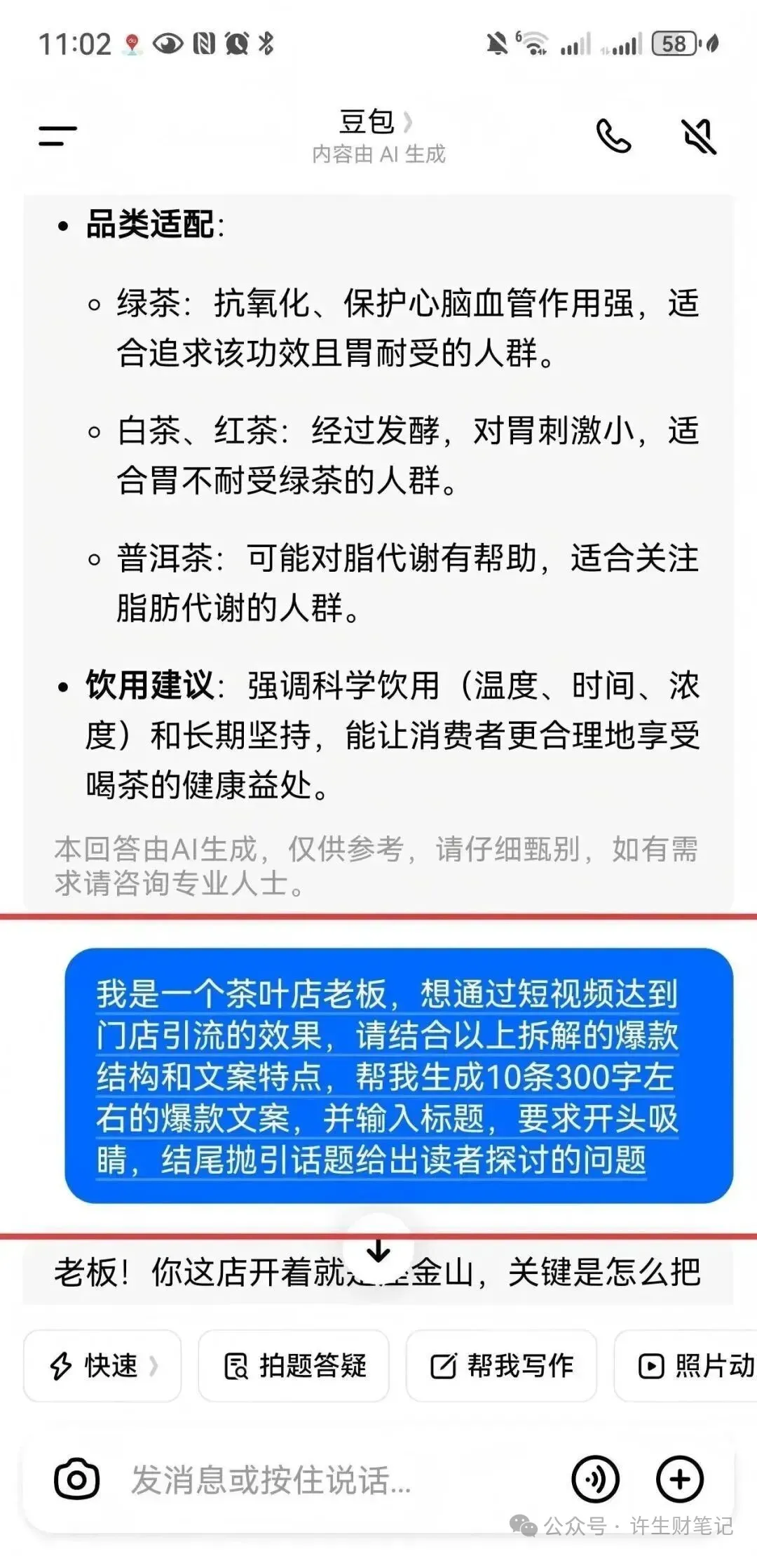 5. 假如你要卖茶叶,那给豆包输入下面的一段提示词,生成对标爆款视频的文案。