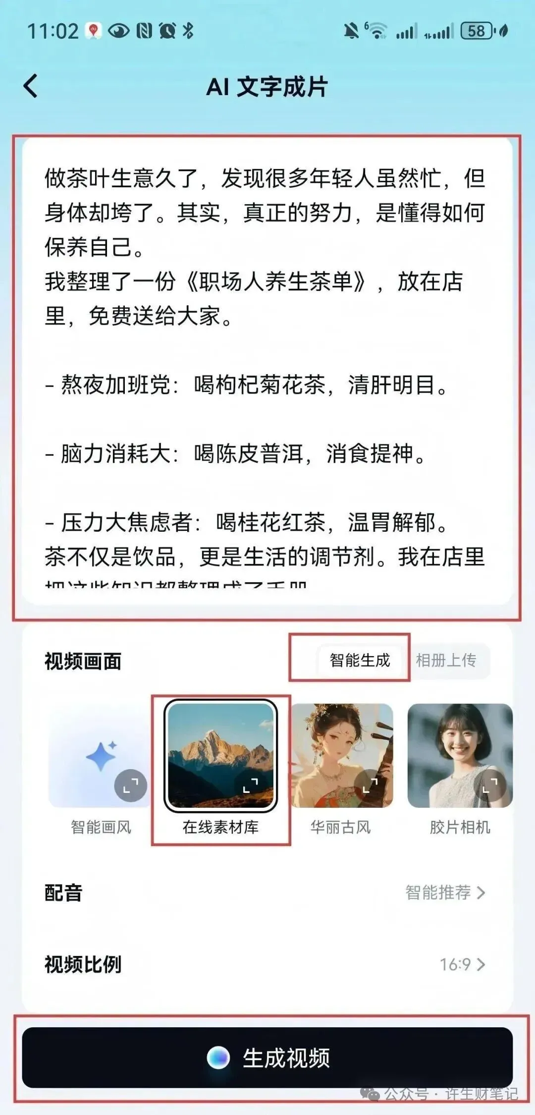 6. 打开剪映>AI文字成片,将豆包生成的文案应用进来,如果有自己有茶叶的素材,可以选相册中的本地素材库,如果没有素材,就选智能生成,AI自动匹配在线素材库,配音和视频比例默认,生成视频即可。