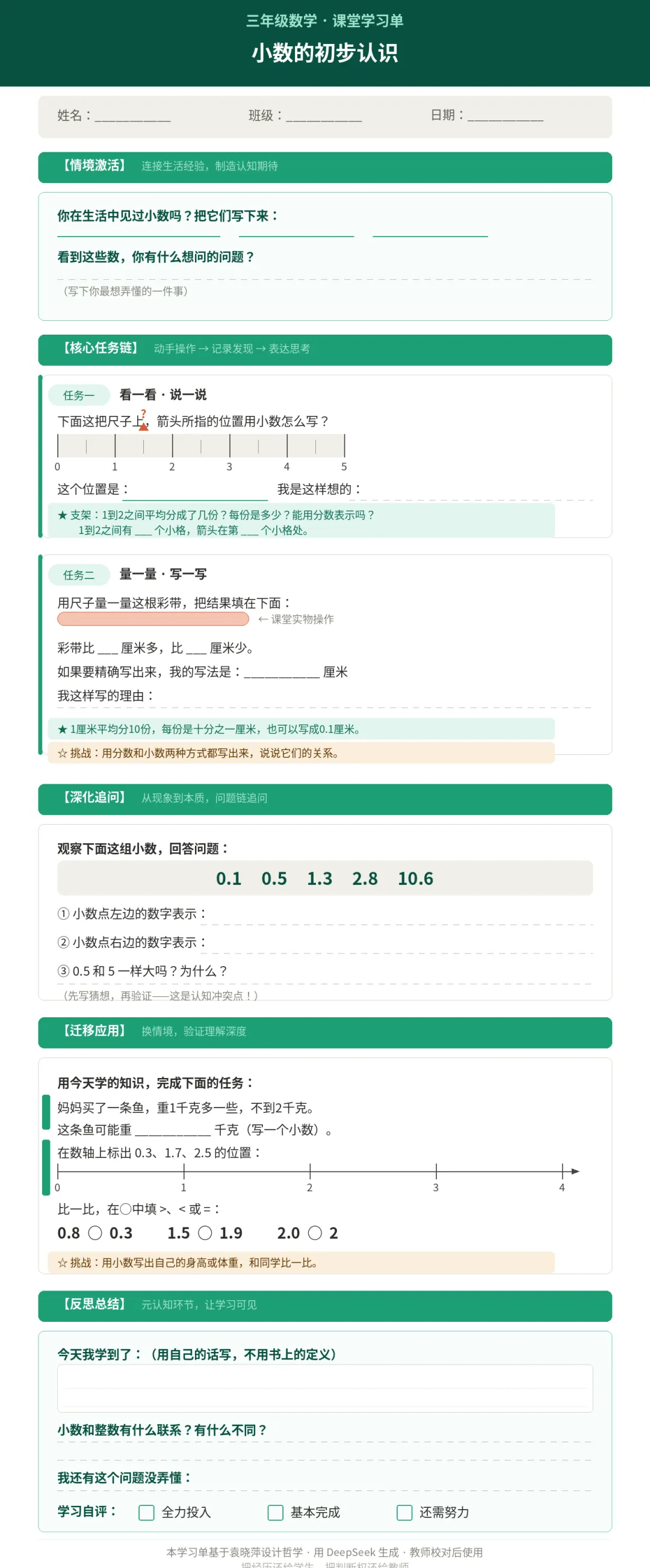 用 DeepSeek 生成袁晓萍特级教师风格数学学习单"老师,0.1 是什么意思?是一块钱里的一分钱吗?"三年级的孩子,第一次看见小数点,脑子里装的是这样的问题。那孩子只是在机械地"念数",他根本没有机会搞清楚: 小数点左边和右边,凭什么能写在一起?卷子考查学生"会不会",学习单引导学生"怎么想"。这篇文章,就是告诉你如何用 DeepSeek,把袁晓萍的设计哲学"翻译"进提示词,一键生成真正有思维含量的数学学习单。在投喂给 AI 之前,先理解 10 条核心设计原则。只有读懂这些,AI 生成的内容才会"像她的课",而不只是"像一张卷子"。这 10 条,后面我会把它们全部"翻译"进提示词,让 AI 自动执行。打开 DeepSeek 官网,点击 📎 上传以下附件:为什么要上传这些? 课标确保目标有依据,教材确保内容不跑偏,样例让 AI 知道你要的"格式感"。三样缺一不可。这是本文最核心的部分。提示词必须把袁晓萍的 10 条原则全部嵌入,同时明确结构要求和输出格式。你是一位深度研究小学数学教学的课程设计专家,设计风格参照以下10条原则:① 学情前测先行,从"已知/能知/未知/想知"定位起点② 用一个真实的大任务驱动整节课③ 具身体验优先,先动手操作,再抽象建模④ 多元表征并行(实物→图示→符号→语言)⑤ 设计认知冲突,让学生先暴露错误再建构规则⑥ 用问题链替代孤立题目⑦ 三层递进结构(理解→应用→迁移)⑧ 支架分层,基础生有提示,能力强的有挑战⑨ 学习过程可见化,记录思考轨迹而非仅记录答案⑩ 反思链收尾,包含元认知环节请为三年级数学《小数的初步认识》设计一张课堂学习单。结构请按照:【情境激活】→【核心任务链】→【深化追问】→【迁移应用】→【反思总结】额外要求:- 为基础薄弱学生提供1个思考支架(用★标注)- 为能力较强学生提供1个挑战任务(用☆标注)- 任务语言清晰,三年级学生可以独立阅读- 输出为HTML格式,提供可下载Word文档功能- 不要输出解释说明,直接给出学习单正文