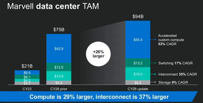 定制加速计算芯片市场,2023年66亿美元 → 2028年554亿美元。年复合增长率53%。