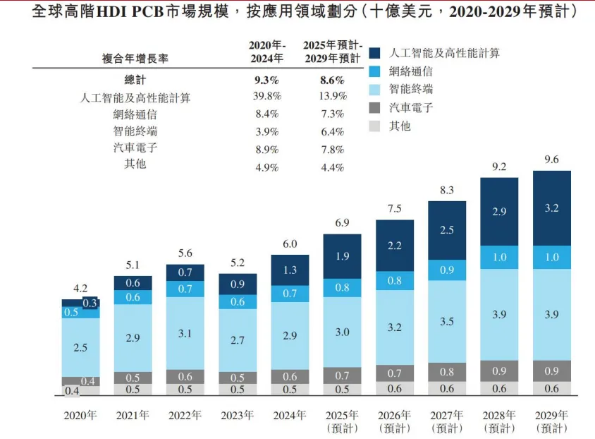 高阶HDI细分市场,年复合增长率20.3%。而整体PCB市场的增速只有4.8%。