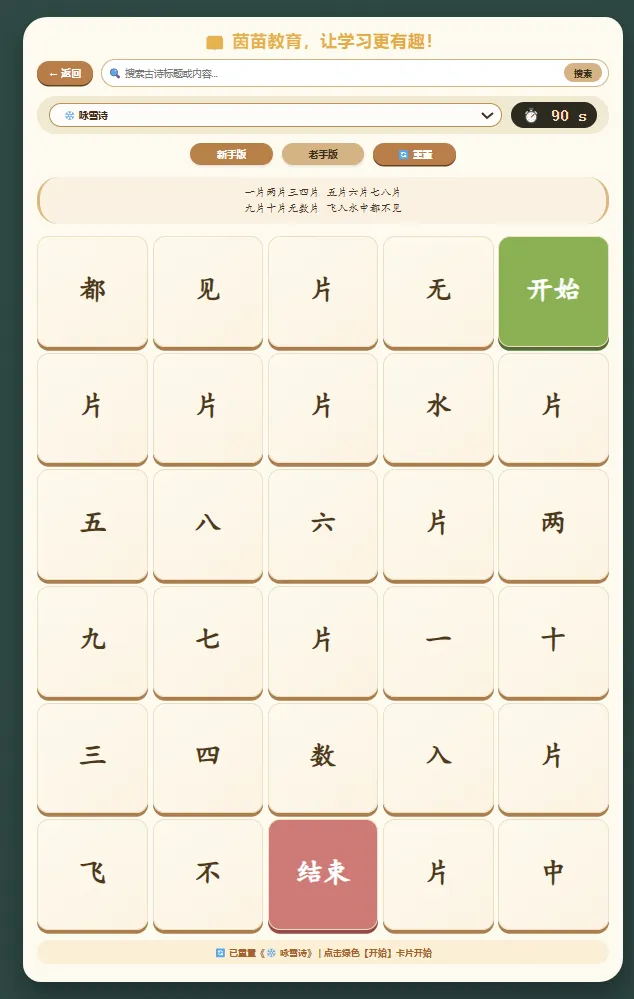 舒尔特方格原本是飞行员和运动员训练注意力的方法:在乱序的数字网格中,按顺序快速点击。我们把它和小学必背古诗结合起来——每一张卡片上都是一个汉字,孩子需要按照诗句的顺序,从第一个字点到最后一个字。