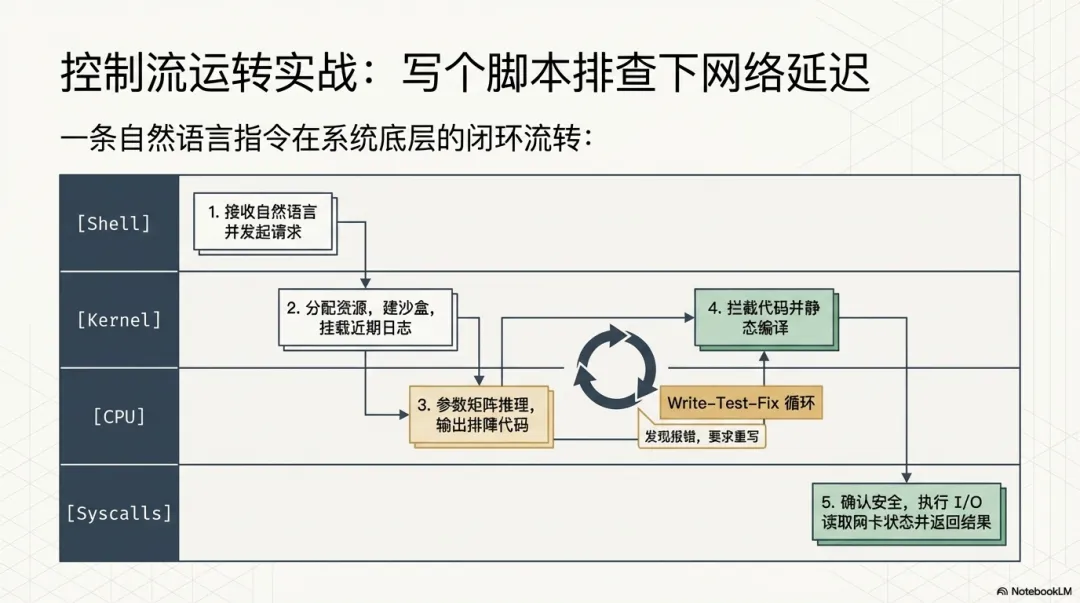 为了便于理解,我们再举一个真实的排障场景深化一下。假设当你在键盘上敲下:"写个脚本排查下网络延迟"时,真实的系统控制流是这样的: