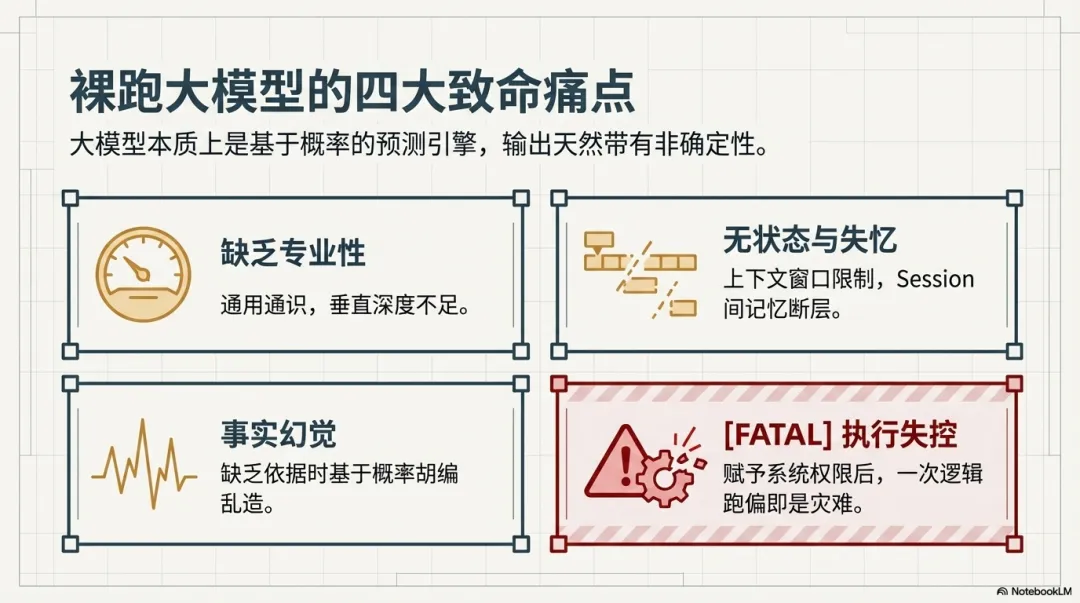 一开始,我们主要把大模型当聊天机器人用。基本形态就是一个"拥有超强大脑的推理引擎"加上一个"简单的交互界面"。但随着用得越来越深,大模型原生架构的局限性开始暴露,主要表现在三个核心痛点: