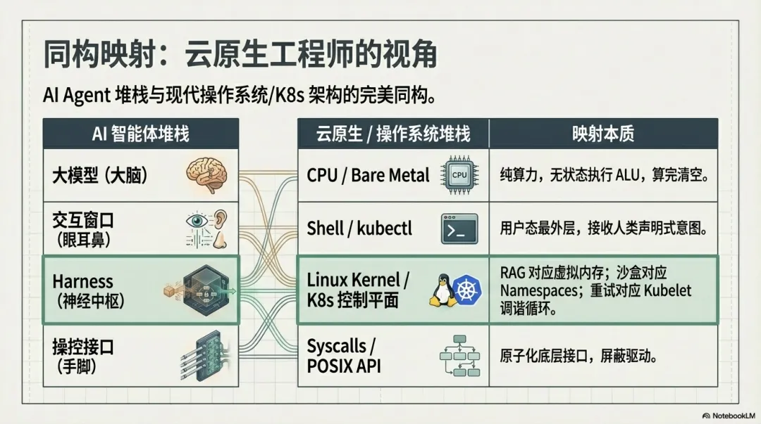 - Harness(神经中枢) ↔️ Linux Kernel / Kubernetes 控制平面: 它是整个系统的灵魂。RAG的内存管理相当于内核的虚拟内存(VMM/Paging)置换;沙盒边界相当于Namespaces与Cgroups;错误重试机制则完美等同于Kubelet的Reconciliation Loop(控制循环),不断调谐系统以达到期望状态。