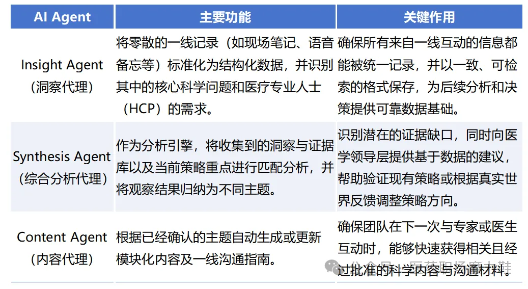 在实际应用中,这一系统通常由三个核心AI模块构成。首先是洞察代理,它负责整理一线医学团队的记录,将零散信息转化为统一标准化的结构数据,并提取关键科学问题,识别核心科学问题和医生(HCP)的需求,确保所有信号都以统一、可搜索的形式记录。其次是综合分析代理,它会将这些洞察与企业证据库和现有策略进行比对,通过数据分析识别趋势和潜在证据缺口,并向医学领导层提供数据支持的建议。第三是内容代理,它可以在战略方向确认后自动生成更新的科学材料(比如:FAQ 和一线指导)和沟通指南,帮助一线团队快速开展新的学术交流。
