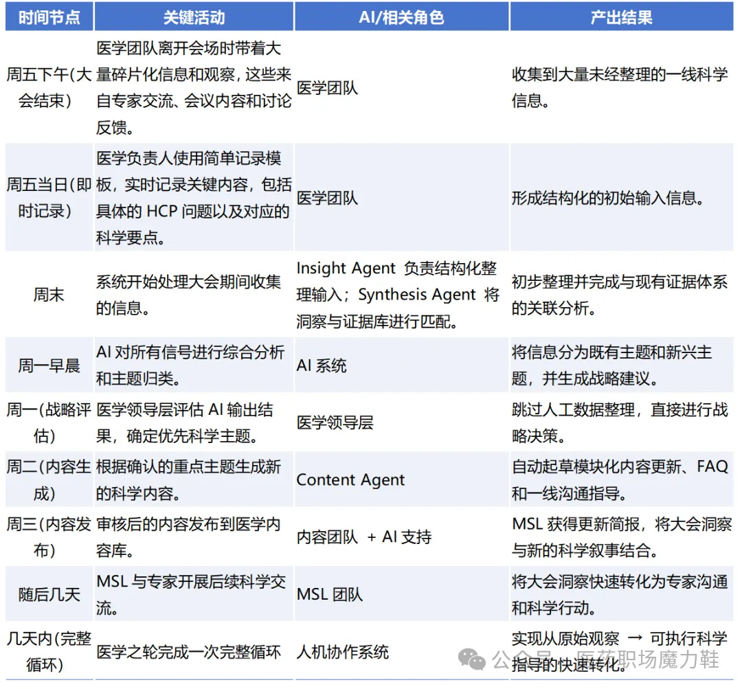 在实际推进过程中,企业不需要立即进行全面的组织重构。更有效的方法是从小范围试点开始,通过几个高频场景验证模型价值。例如,医学大会后的洞察转化流程或关键意见领袖交流循环,都是适合测试新模式的场景。这些场景信息密集、反馈周期短,能够快速展示AI带来的效率提升。
