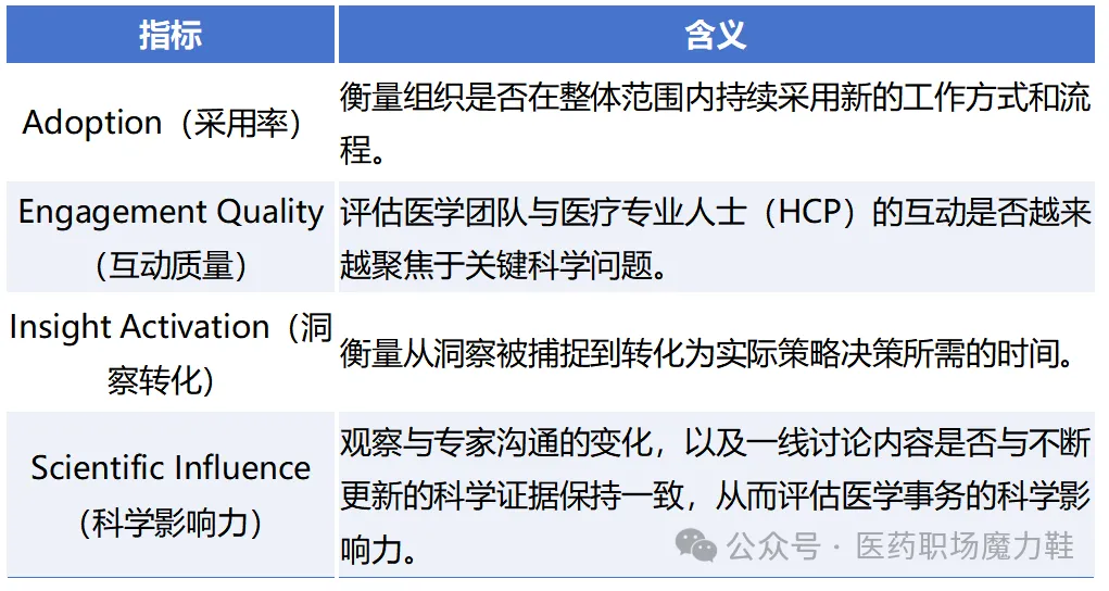 在“360医学互动模型”中,医学事务的成功标准不再只是活动数量,而是组织学习能力和科学影响力。新的指标体系更加关注洞察转化速度、互动质量以及科学共识的形成。例如,组织可以通过观察新工作方式的采用率来评估转型进展,通过分析交流内容是否越来越聚焦关键科学问题来衡量互动质量。