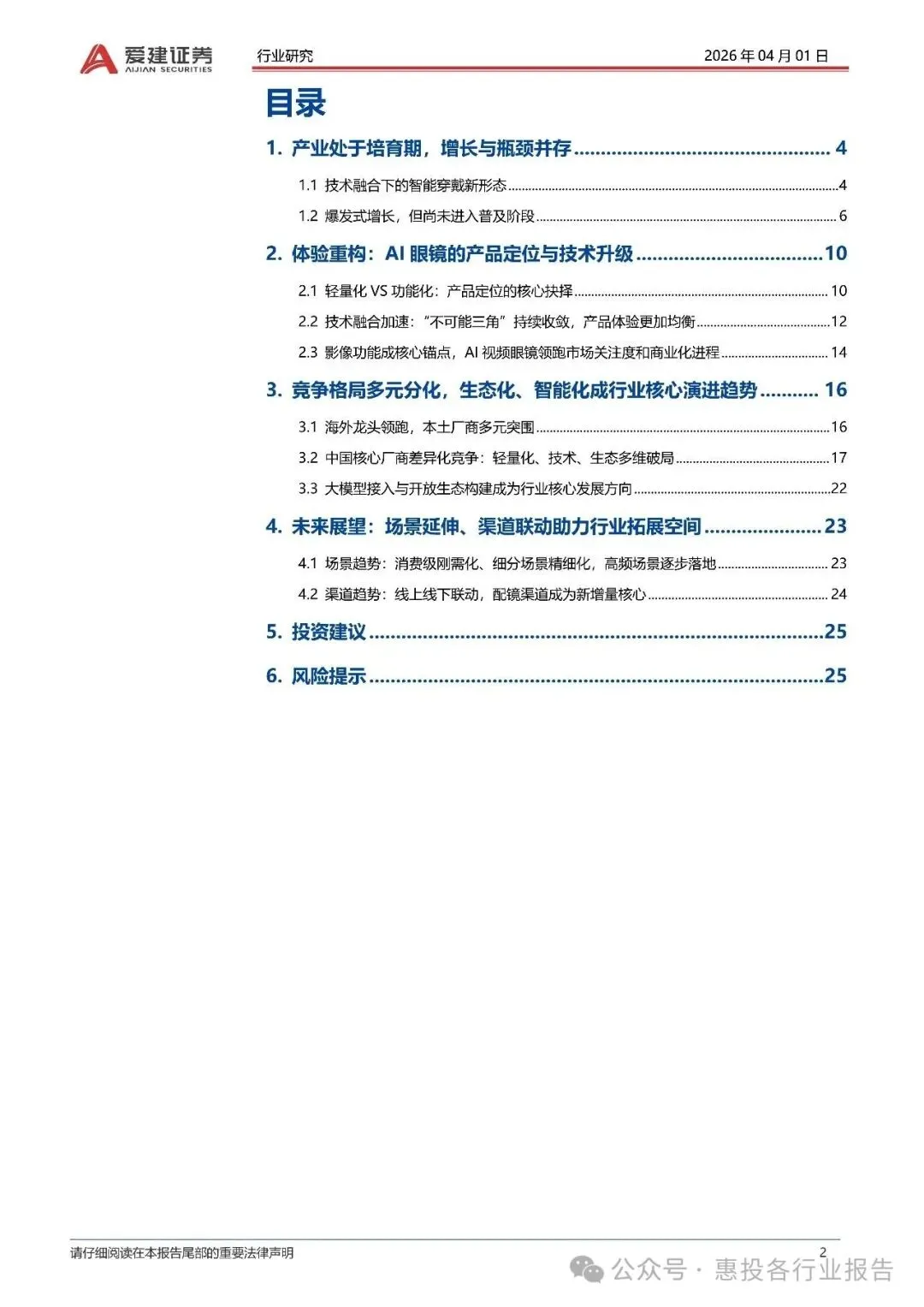 AI眼镜行业正处于快速增长与市场培育并存的关键阶段,技术融合与生态构建成为推动行业发展的核心动力。尽管当前市场仍以中高端产品为主,但随着供应链成熟与价格下探,大众市场有望被激活。未来,AI眼镜将向消费级刚需化、细分场景精细化发展,生态与AI能力的结合将决定厂商的市场地位。投资建议聚焦于技术领先与生态联动的厂商,同时需警惕市场推广、竞争加剧及政策合规等风险。