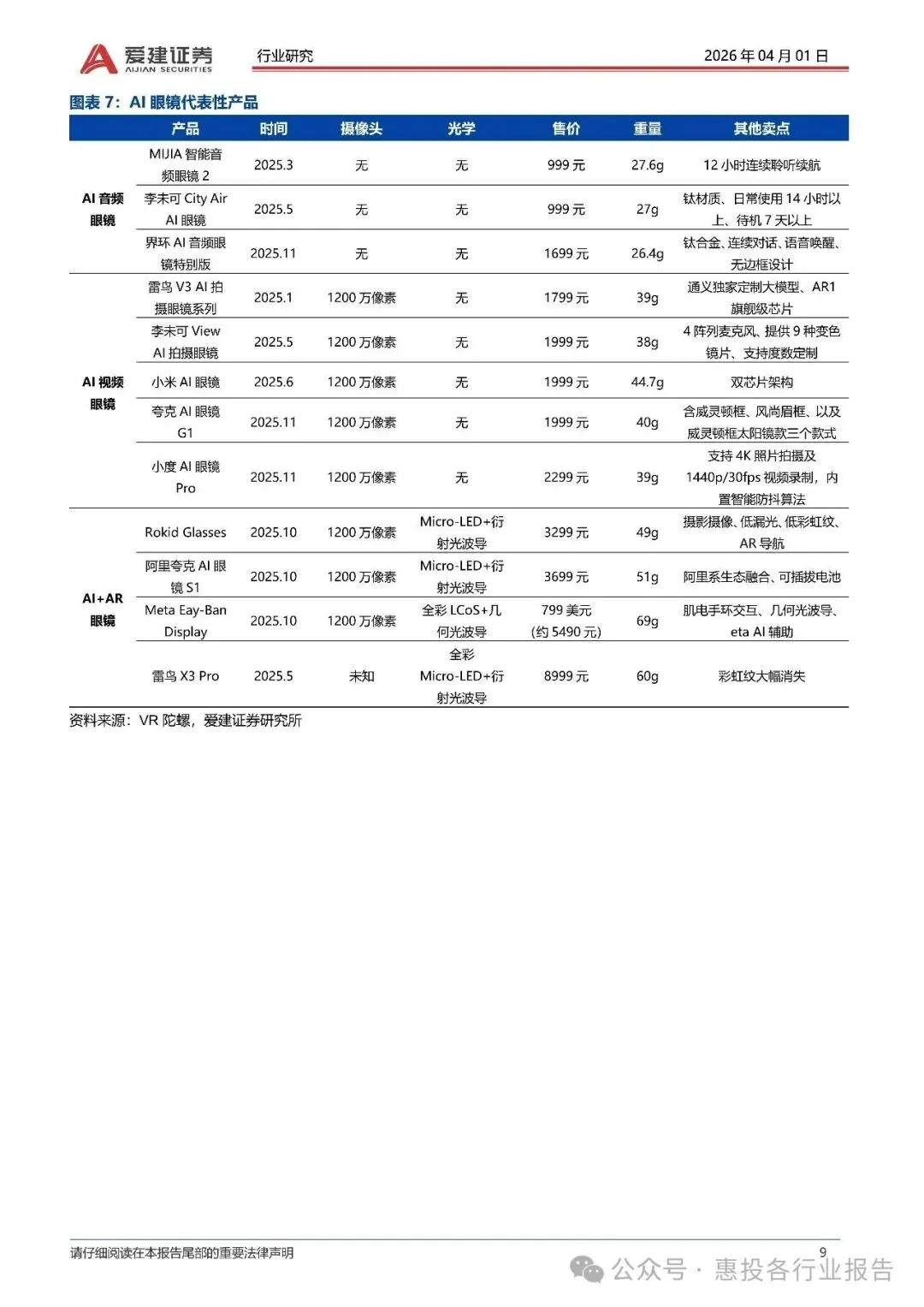 | 类型 | 核心功能 | 价格区间 | 重量 | 优势 ||------|----------|----------|------|------|| AI音频眼镜 | 语音交互、基础音频功能 | 999-1699元 | 27-45g | 轻量化、长续航、亲民价格 || AI视频眼镜 | 影像采集、AI视觉识别 | 1799-2299元 | 38-44g | 影像功能突出、支持多种AI应用 || AI+AR眼镜 | 虚拟信息叠加、空间交互 | 3299-8999元 | 49-60g | 技术壁垒高、功能全面、体验沉浸 |