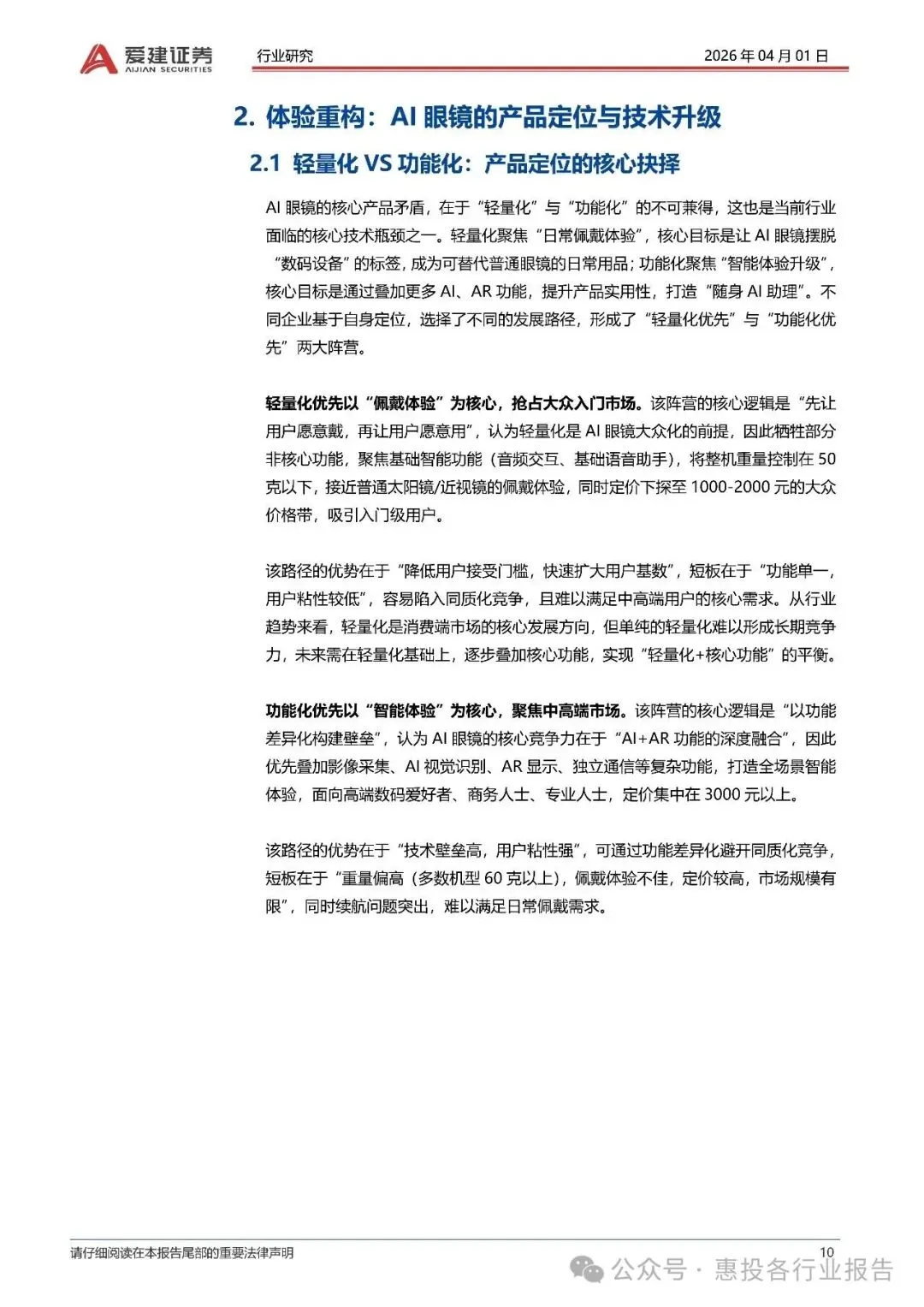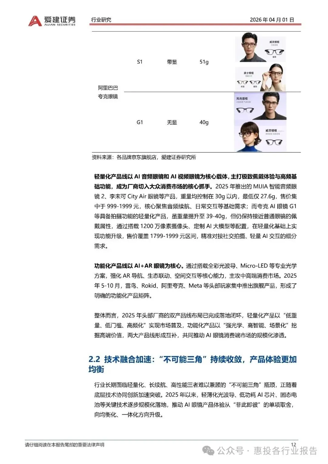 :AI眼镜分为AI音频眼镜、AI视频眼镜和AI+AR眼镜三大类,分别聚焦于轻量化、影像功能与智能交互。 - 技术瓶颈:行业面临“轻量化、长续航、高性能”三者难以兼顾的“不可能三角”问题,但随着光波导、MicroLED等技术的成熟,产品体验正逐步优化。
