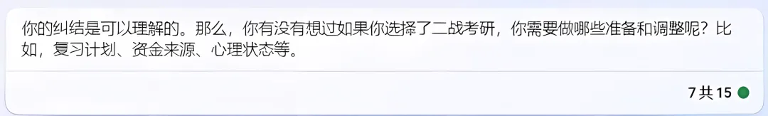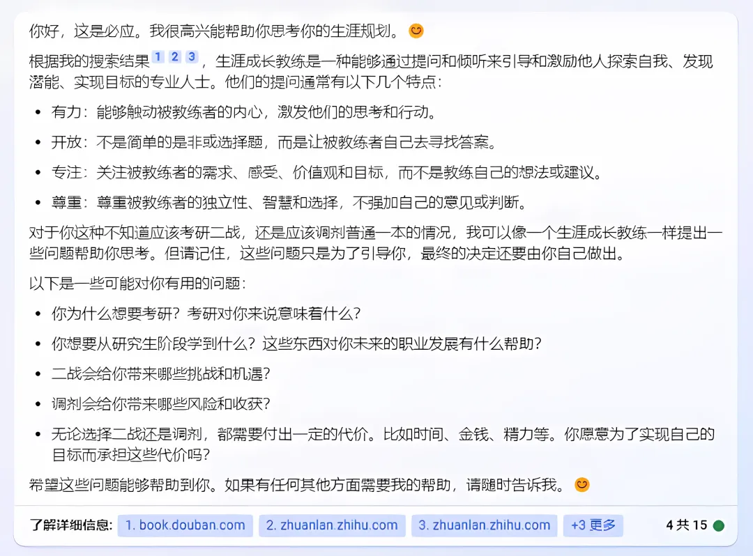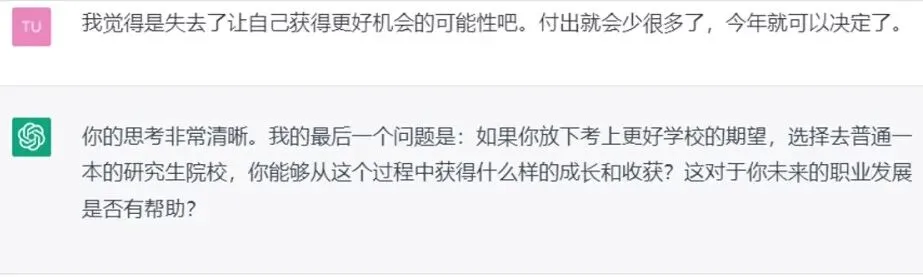 这个回答开始让土豆吃惊了,ChatGPT不仅懂什么是生涯成长教练,而且列出的这几个问题,还真值得面临考研二战选择的同学好好思考一下。