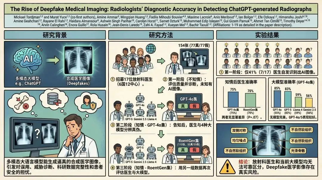 近期,国际顶级放射学期刊《Radiology》在线发表了一项重磅研究,标题为《The Rise of Deepfake Medical Imaging: Radiologists’ Diagnostic Accuracy in Detecting ChatGPT-generated Radiographs》。这项由美国西奈山伊坎医学院等全球多中心团队完成的研究,向医学界乃至整个社会发出了明确警告:由ChatGPT等大语言模型(LLM)生成的“深度伪造”(Deepfake)医学影像,已经逼真到足以混淆专业放射科医生的判断。