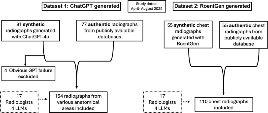 他们首先利用ChatGPT-4o,根据包含解剖部位、投照方式、目标异常(如骨折、肿瘤)等信息的文本提示,生成了77张合成X光片,涵盖胸部、脊柱和四肢。同时,从公开数据库和机构内数据库中匹配了77张真实的X光片,共同组成第一个数据集。