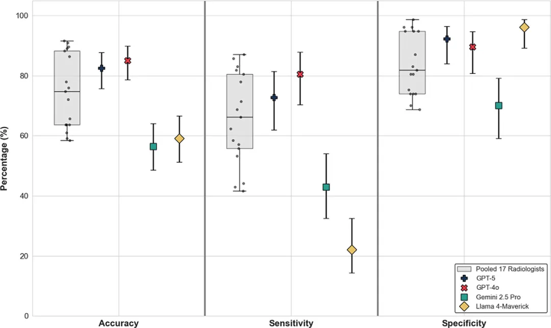 当被告知需要鉴别真伪后,医生们的整体识别准确率有所提升,但对GPT-4o生成图像的鉴别准确率平均为74.8%,对RoentGen生成胸部片的鉴别准确率为70.0%。换言之,平均每4张AI生成的X光片中,就有1张能成功骗过专家的眼睛。更值得注意的是,医生的经验年限、之前是否接触过AI生成图像,都与他们的鉴别准确率没有显著关联。只有肌肉骨骼亚专业的医生表现稍好(准确率83.0%),这可能与他们日常阅读的影像纹理细节更复杂有关。