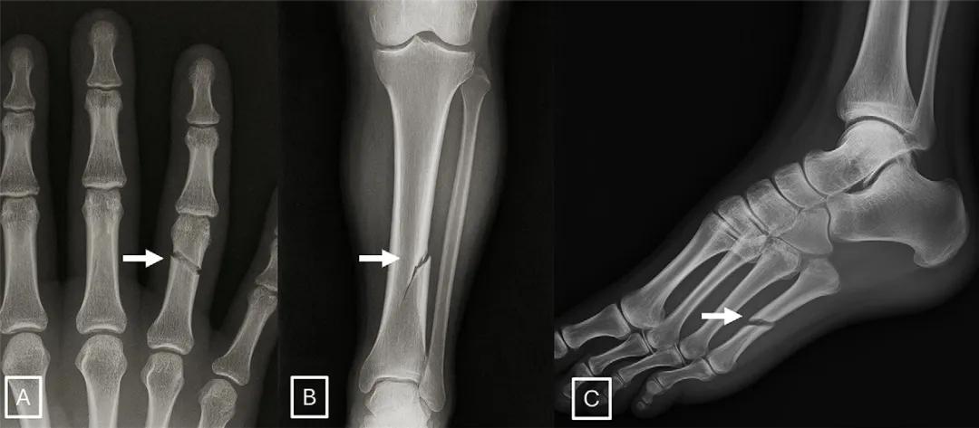 过度的对称性:AI倾向于生成完全对称的解剖结构,例如脊柱完美笔直,除非特意提示“脊柱侧弯”。 均匀的纹理与噪声:真实X光片的颗粒噪声分布是不均匀的,而AI生成的图像噪声往往过于均匀一致。 不自然的软组织纹理:肌肉、脂肪等软组织的灰度过渡有时显得 subtly(微妙地)不自然。 过于光滑的骨骼:骨皮质的边缘异常光滑,厚度均匀,缺乏真实骨骼那种自然的微小不规则和纹理。 “理想化”的骨折线:AI生成的骨折线往往异常清晰、平滑,有时甚至是单皮质的(仅一侧骨皮质断裂),这与真实创伤中复杂、粗糙的骨折形态不同。