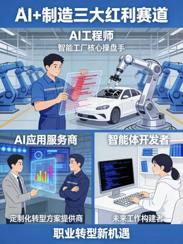 学会AI大模型应用能力、工业场景理解能力、智能体设计能力,你就可以向行业、场景、管理等智能体来发展,想要转型的话,首先需要学习工业知识,深入工厂场景,最后打造智能体产品来实现。