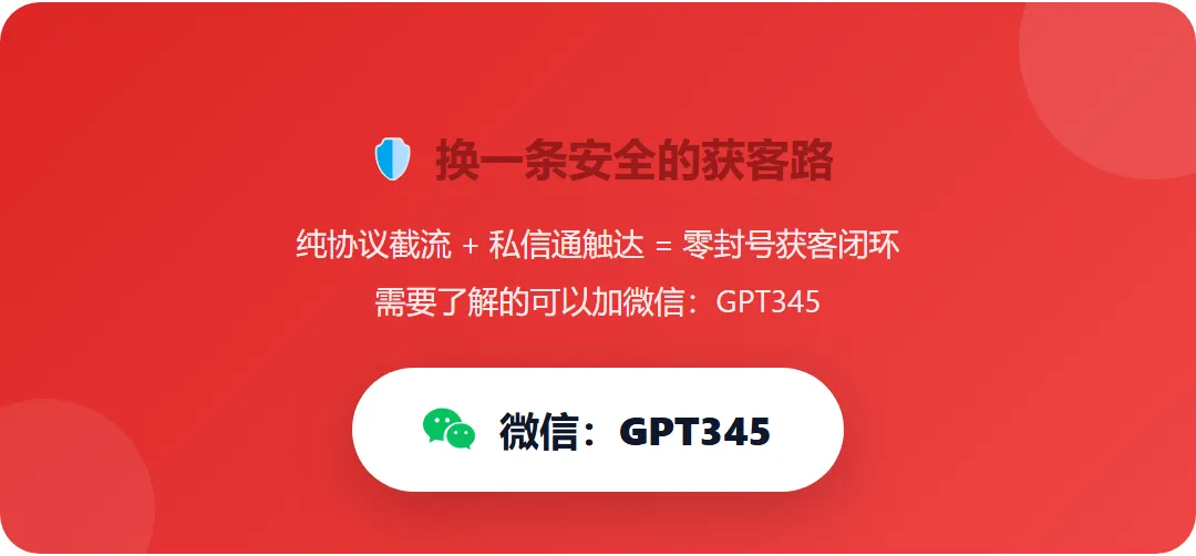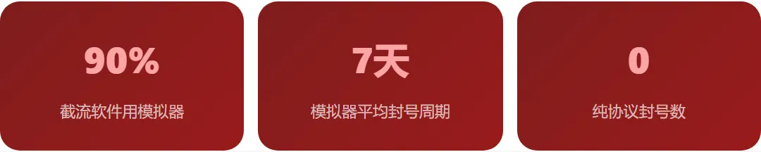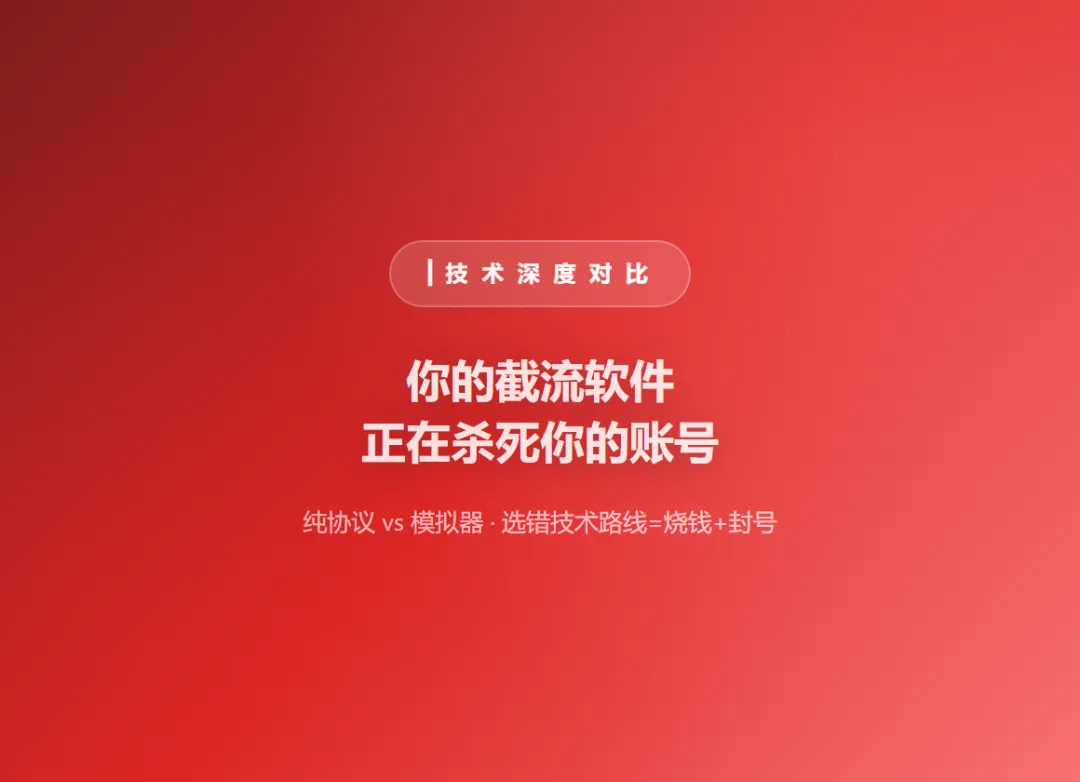 还在用模拟器软件的朋友,别再拿自己的账号当炮灰了。封一个号,养号+重建权重至少要2-4周,这段时间你的同行已经用纯协议挖走了你本该拿到的客户。