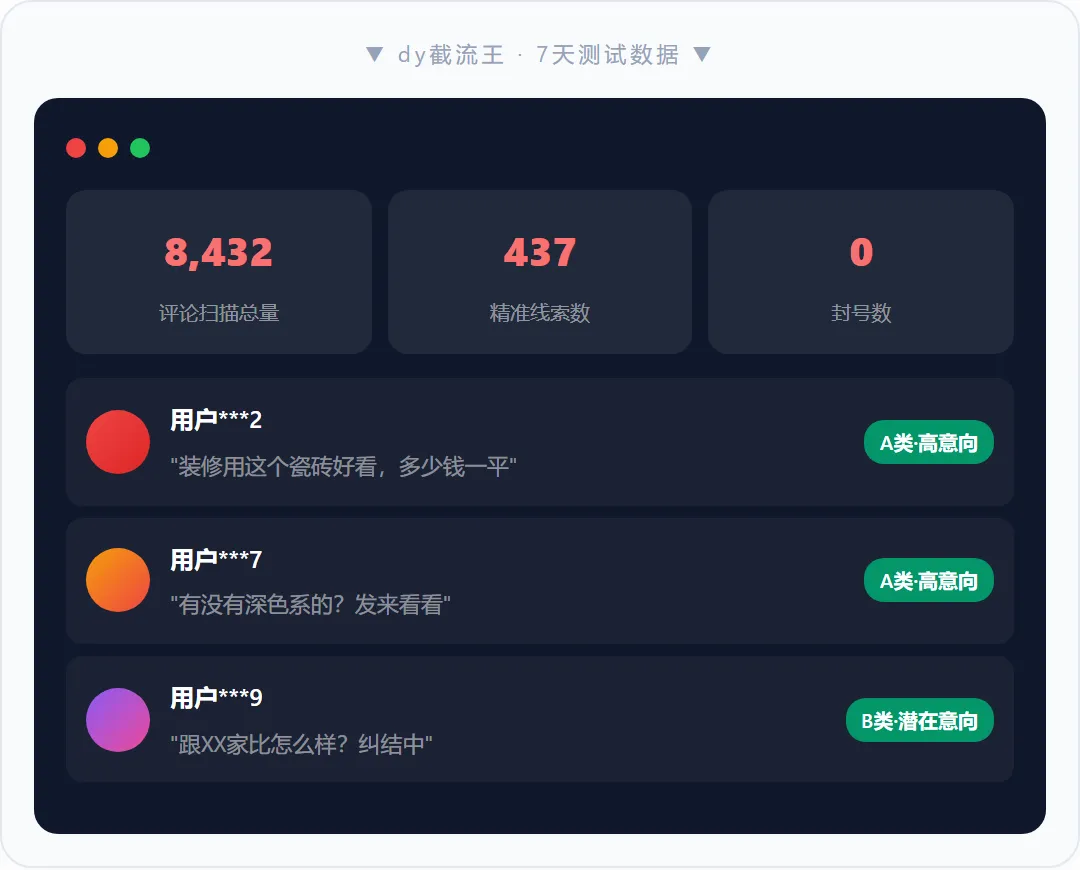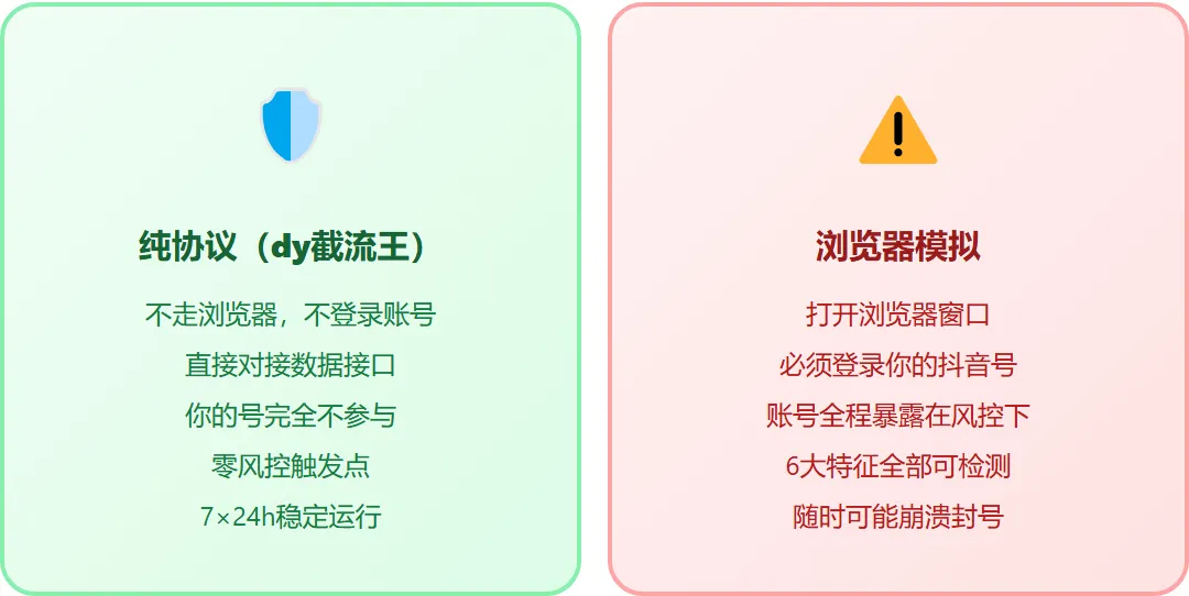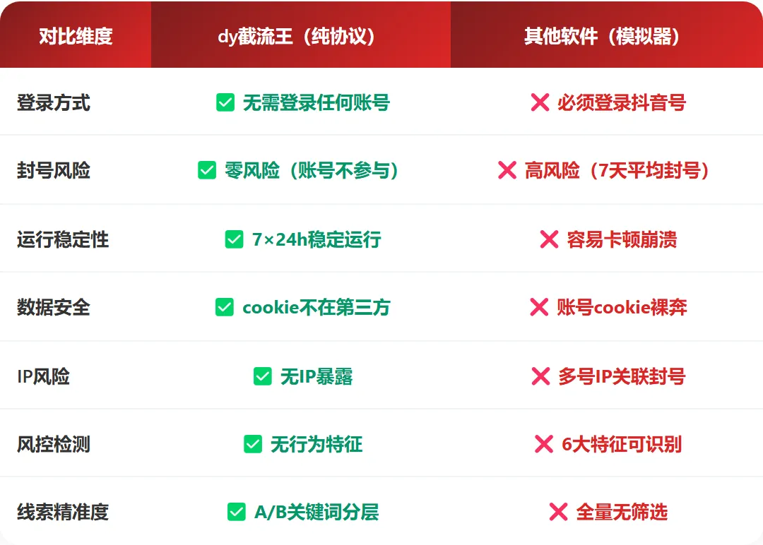 💡 市面上90%的截流软件都基于浏览器模拟技术——这意味着它需要登录你的抖音号,模拟真人操作。听起来好像没问题,但抖音的风控系统早就不是3年前那个了。