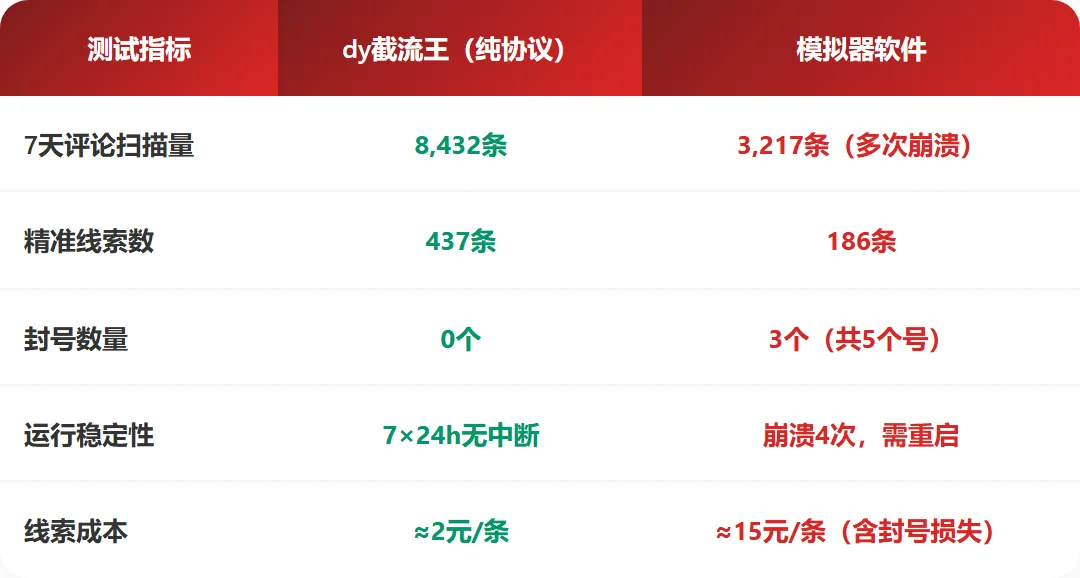 我们做了一组对照测试:同样的关键词、同样的目标视频,分别用dy截流王(纯协议)和某模拟器软件跑7天。