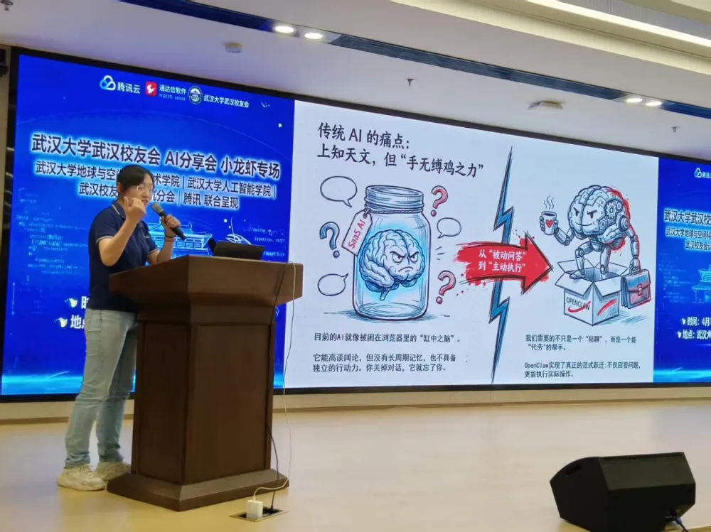 AI与诗意交汇,校友情与时代感共鸣|武汉大学武汉校友会AI分享会“小龙虾专场”成功举办当AI浪潮奔涌而来,武大校友再次相聚珞珈,共话技术前沿、产业变革与时代机遇。4月11日下午,武汉大学武汉校友会AI分享会“小龙虾专场”在武汉大学举行。多位专家学者、企业代表和校友嘉宾带来精彩分享,现场既有人工智能前沿趋势的深度解读,也有踊跃安装“小龙虾”的实践互动,还有深受欢迎的新书签名赠书环节,充分展现了武大人兼具科技视野与人文情怀的独特气质。4月11日(周六)下午,武汉大学武汉校友会AI分享会“小龙虾专场”在武汉大学于刚宋晓楼A712报告厅成功举办。本次活动由武汉大学武汉校友会主办,武汉大学地球与空间科学技术学院、武汉大学人工智能学院、武汉大学武汉校友会计算机分会、腾讯云、深圳财富趋势联合呈现,200多位校友、师生齐聚现场,共同交流人工智能前沿趋势与实践应用。本次活动聚焦人工智能技术前沿、产业落地与未来趋势,邀请高校专家、企业代表和校友嘉宾作主题分享。整场活动内容充实、交流热烈,既有对AI技术演进和行业应用的深入解读,也有校友间关于成长、实践与人文表达的真诚交流,充分展现了武大校友群体开放、创新、包容、多元的精神风貌。图|200多位校友参加分享会01聚焦AI前沿,共话时代机遇活动由武汉大学武汉校友会计算机分会秘书长刘伟主持。刘伟秘书长在开场中表示,春节前计算机分会曾举办AI主题分享活动,获得了不少校友的认可与支持。春节前后,人工智能技术发展日新月异,尤其多智能体、开源智能体平台等方向持续升温。应广大校友期待举办本次AI分享会,希望围绕当下热点技术与真实应用场景,搭建一个高校、企业、校友之间深度交流、共同学习的平台。图|刘伟秘书长主持武汉大学武汉校友会会长黄山在致辞中表示,本次活动是一场“既有烟火气、又有科技感”的分享会。一边是面向未来的前沿科技,一边是校友之间真诚而深入的交流互动,这正是武大人“自强、弘毅、求是、拓新”精神在新时代的生动体现。黄山会长指出,当前我们正处于人工智能快速发展、国际科技竞争日趋激烈的重要时期。AI已不再是遥远的概念,而是正在深刻重塑科研范式、产业格局和学习方式的重要力量。面对这样的时代浪潮,仅有理论认知远远不够,更重要的是主动实践、持续学习,在应用中不断提升理解力、行动力和创新力。希望广大校友和同学珍惜此次交流机会,在聆听专家分享、参与实践探索的过程中感受科技力量、把握时代机遇,以武大人的担当在AI发展的新赛道上奋勇前行。图|黄山会长致辞02学界前沿分享:从多智能体到智能气象本次活动邀请多位来自武汉大学相关学院的专家学者,围绕人工智能前沿发展和交叉应用展开分享。谢倩倩教授:多智能体的发展现状、趋势与未来武汉大学人工智能学院教授、语言与信息研究中心副主任谢倩倩,以《多智能体发展现状和趋势》为题作主题分享。她从单一大模型的能力边界切入,系统介绍了多智能体的基本概念、核心组件、组织方式与发展路径。她指出,单个大模型在上下文长度、知识覆盖、复杂决策和可解释性等方面都存在局限,而多智能体通过任务拆解、角色分工、协作反馈、工具调用和记忆增强等机制,能够更高效地处理复杂任务,实现AI从“单兵作战”向“团队协同”的跃迁。结合当前业界热点,谢倩倩教授重点讲解了多智能体在办公协作、编程支持、复杂决策等领域的应用前景,并深入分析了MCP、Skill等近期受到广泛关注的关键能力和标准化趋势。她同时指出,当前多智能体技术仍然面临稳定性、成本、安全、治理等多方面挑战,未来人机协同将成为重要发展方向。在分享最后,她还介绍了团队在医疗和金融领域开展的多智能体研究成果,展现了人工智能在高复杂度场景中的实际潜力和学术价值。图|谢倩倩教授分享刘默然教授:AI赋能气象时空感知与预测武汉大学地球与空间科学技术学院副教授刘默然以《基于深度学习的智能气象时空感知与预测技术研究与应用》为题作主题分享。他围绕人工智能在气象监测、数据感知和降雨预测等方向的应用展开介绍,重点分享了通过导航卫星观测、水汽反演、多源数据融合以及深度学习模型,提升气象感知与短时临近预报能力的研究进展。刘默然教授指出,传统气象预测在实时性和精细化方面存在一定局限,而AI技术的发展为复杂天气过程建模和极端天气预测提供了新的技术路径。团队围绕水汽监测、强对流天气预测、降雨事件分析等方向开展了持续探索,在城市防灾减灾、天气预警等场景中具有良好的应用前景。相关成果既体现了人工智能与地学深度交叉融合的趋势,也展示了武大科研团队服务国家需求、面向现实问题的研究担当。图|刘默然教授分享03产业实践观察:AI正在从“会说”走向“会做”除了学界前沿分享,本次活动也邀请来自产业一线的嘉宾,从企业应用和真实场景出发,介绍AI技术落地的新趋势、新路径。陈红女士:智能体时代,AI正走入真实工作流腾讯云生态AI解决方案架构专家陈红女士围绕OpenClaw与WorkBuddy作主题分享。她结合近年来人工智能的发展脉络,从AIGC兴起、大模型能力升级,到智能体、多模态交互和自动化办公的快速发展,梳理了AI应用范式的演进。她认为,AI正