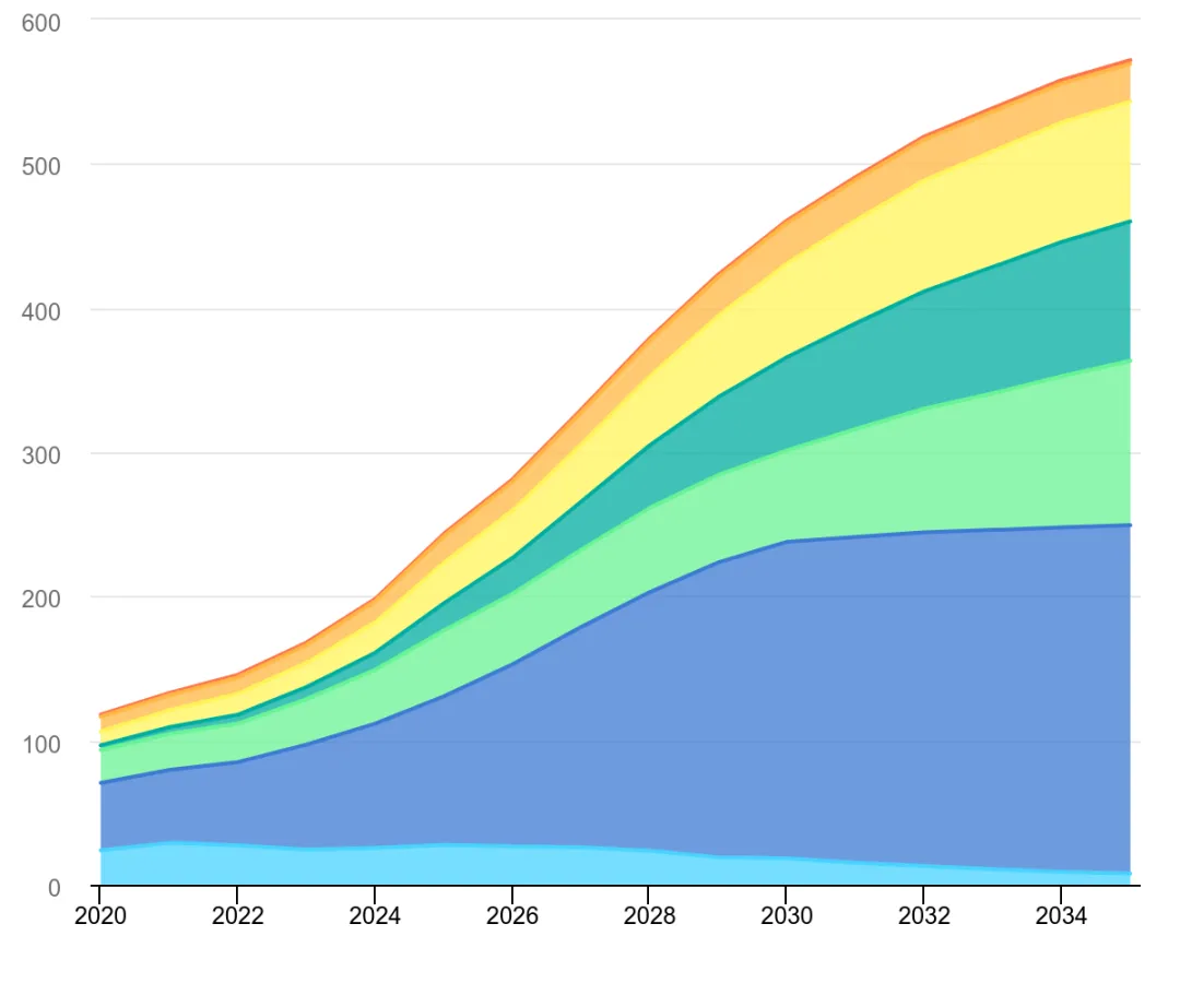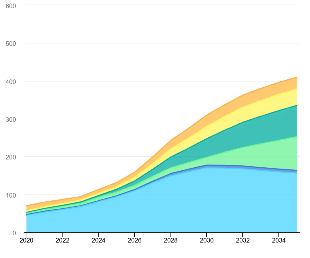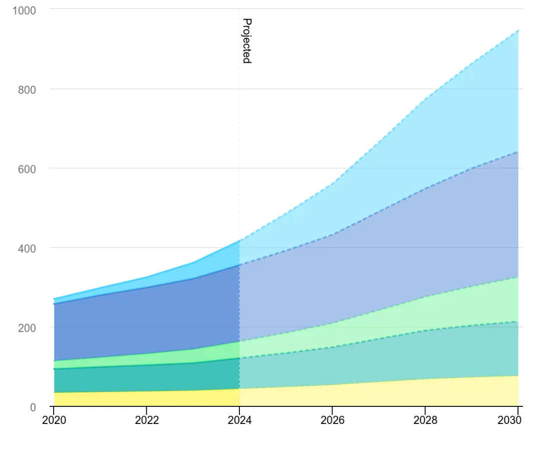 全球数据中心电力消耗(按设备类型划分,基准情景,2020-2030 年)