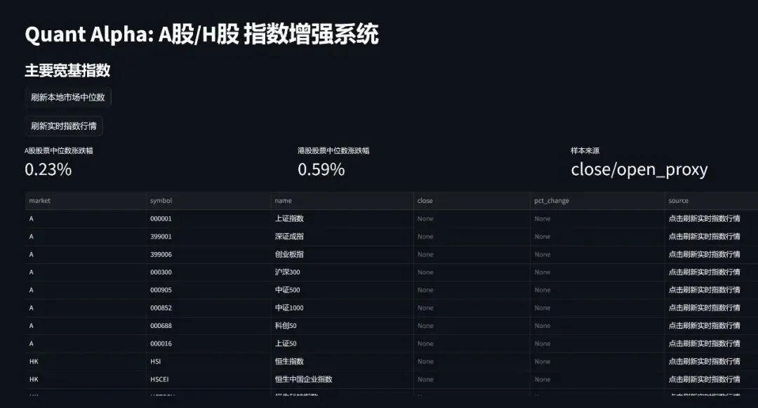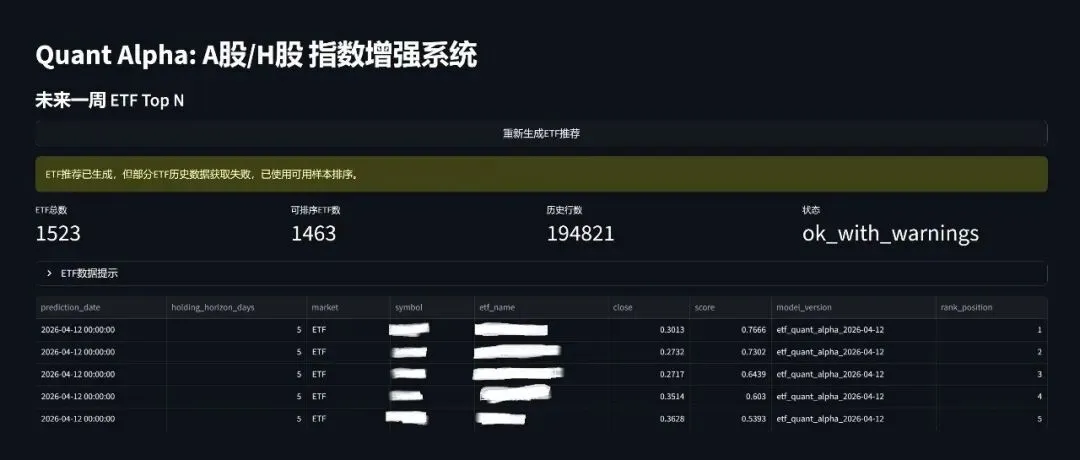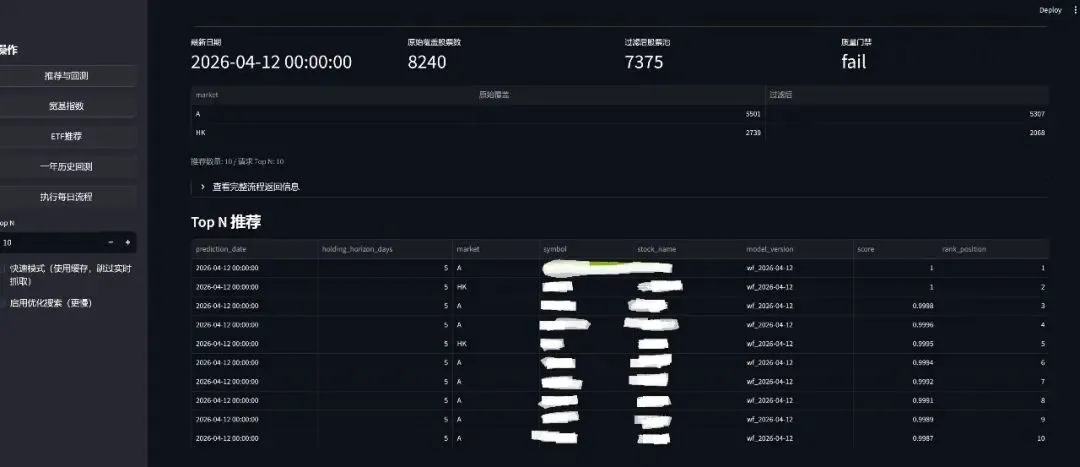 再比如免费的股票数据接口。不要钱的时候很香,但一旦不稳定,你就会明白,技术世界里最贵的东西,往往就是“免费”。因为我跑的是 A 股、H 股全市场,加起来八千多只股票,筛掉一部分仙股之后再建模;ETF 这边也是全市场一千多只,运算量并不小。今天能拉,明天超时,后天给你返回一堆空值。你花半天排查,最后发现不是自己写错了,是源头先抽风了。