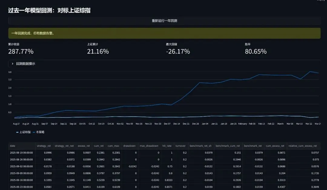 这一版过去一年的回测结果也已经跑出来了:策略累计收益 287.77%,同期上证综指 21.16%,最大回撤 -26.17%,胜率 80.65%。