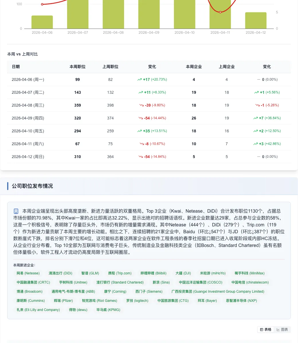 本周发布节奏彻底颠覆了“周一高峰、周末冷清”的常规认知。周三(4月8日)以359个职位登顶,环比上周同日暴增1096.7%;周四维持320个高位;而最令人意外的是周日(4月12日)——竟有310个职位上线,远超周六的67个。结合参与企业数分析,周日仅5家企业活跃,平均每家发布62个职位,这极可能是Kwai或Netease在周末利用系统批量刷新招聘公告所致。