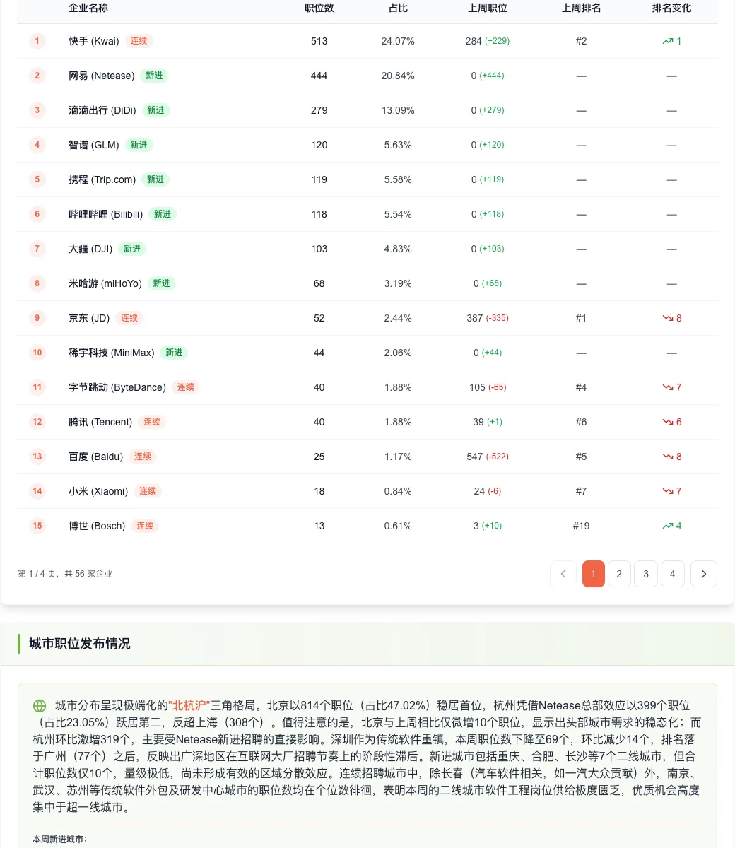 Kwai一家便发布了513个职位,占全市场32.22%;Netease作为本周新进力量,一口气释出404个职位(占比25.38%)。仅此两家即瓜分了57.6%的蛋糕。若再加上DiDi的213个职位,Top 3企业市场份额突破七成。这种寡头垄断格局意味着:一旦大厂招聘窗口关闭,下周总量极可能出现断崖式回落,求职者需对此保持清醒认知。